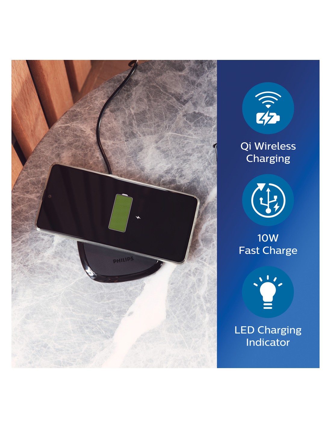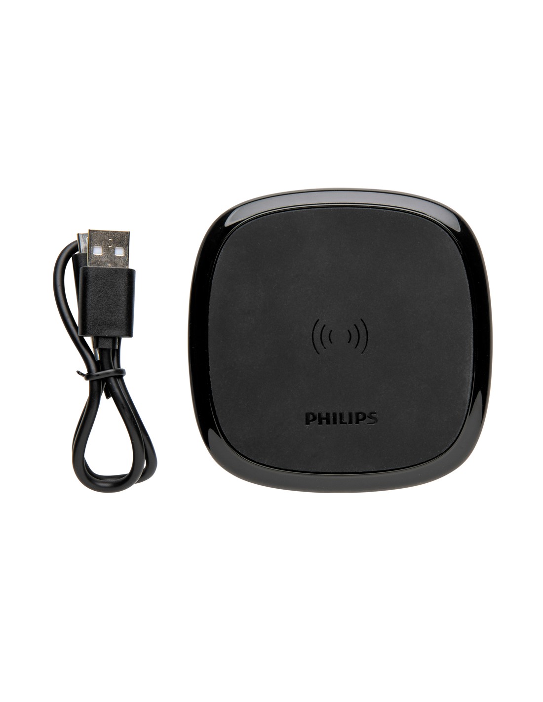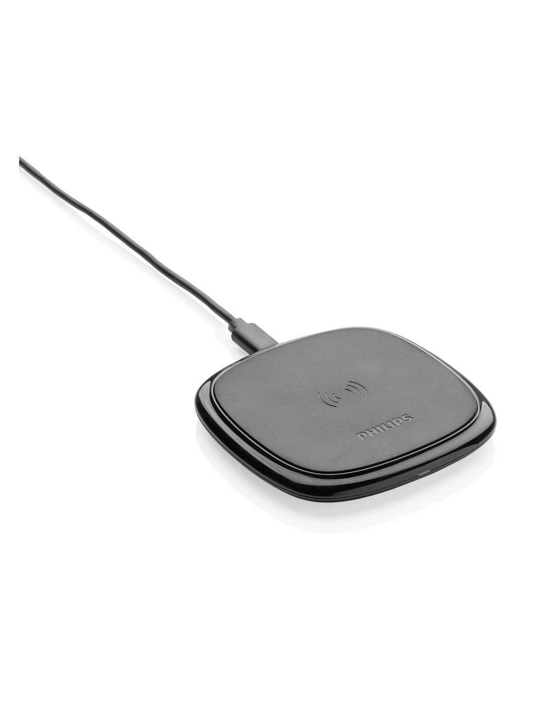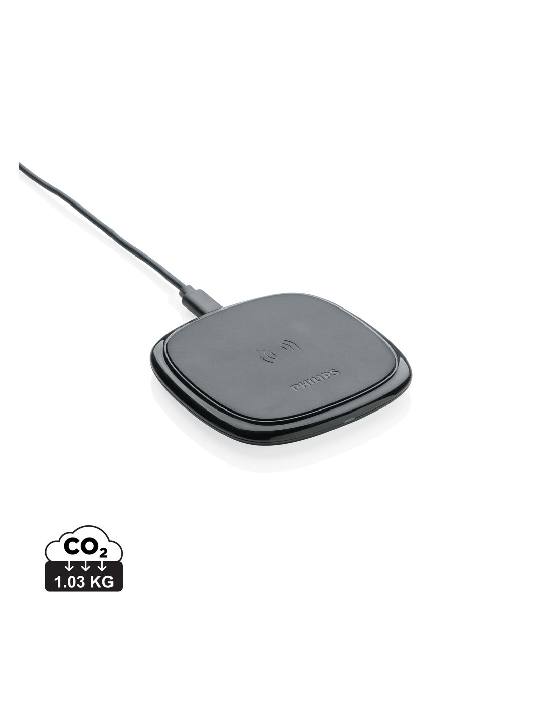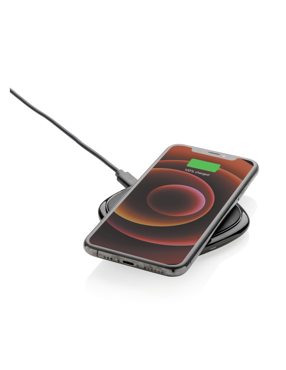 Caricabatterie wireless da 10 W di forma esagonale, realizzato in gomma e bambù con trattamento antibatterico e logo luminoso. Fornito in una confezione regalo nera realizzata in carta kraft riciclata con cavo in plastica PET riciclata. Brevetto EUIPO EUROPA.