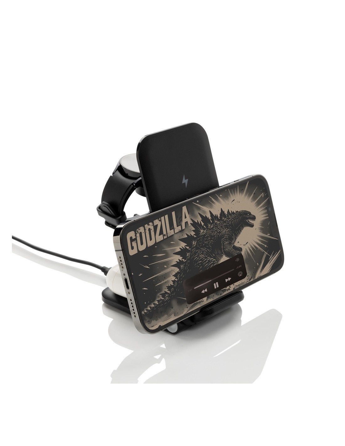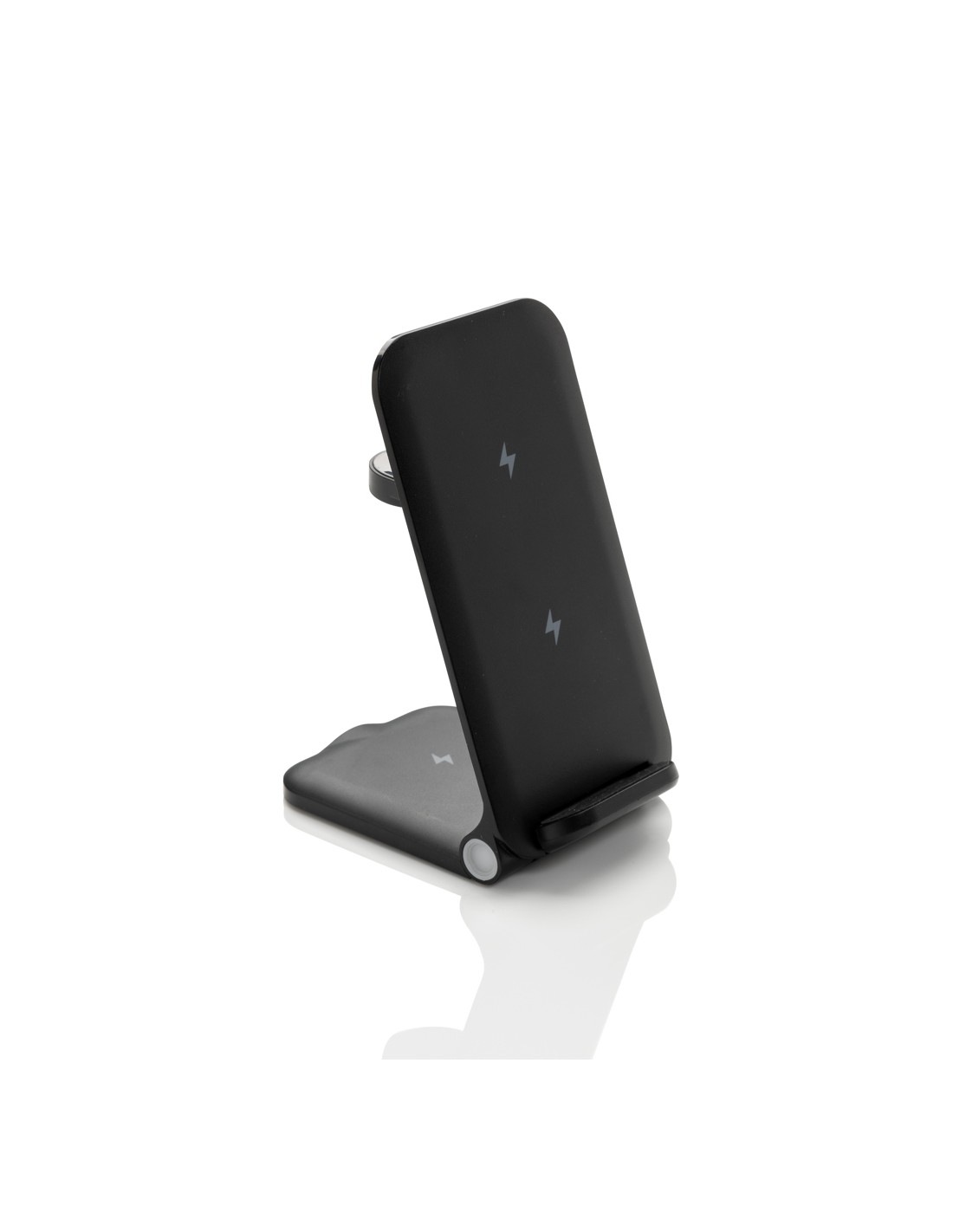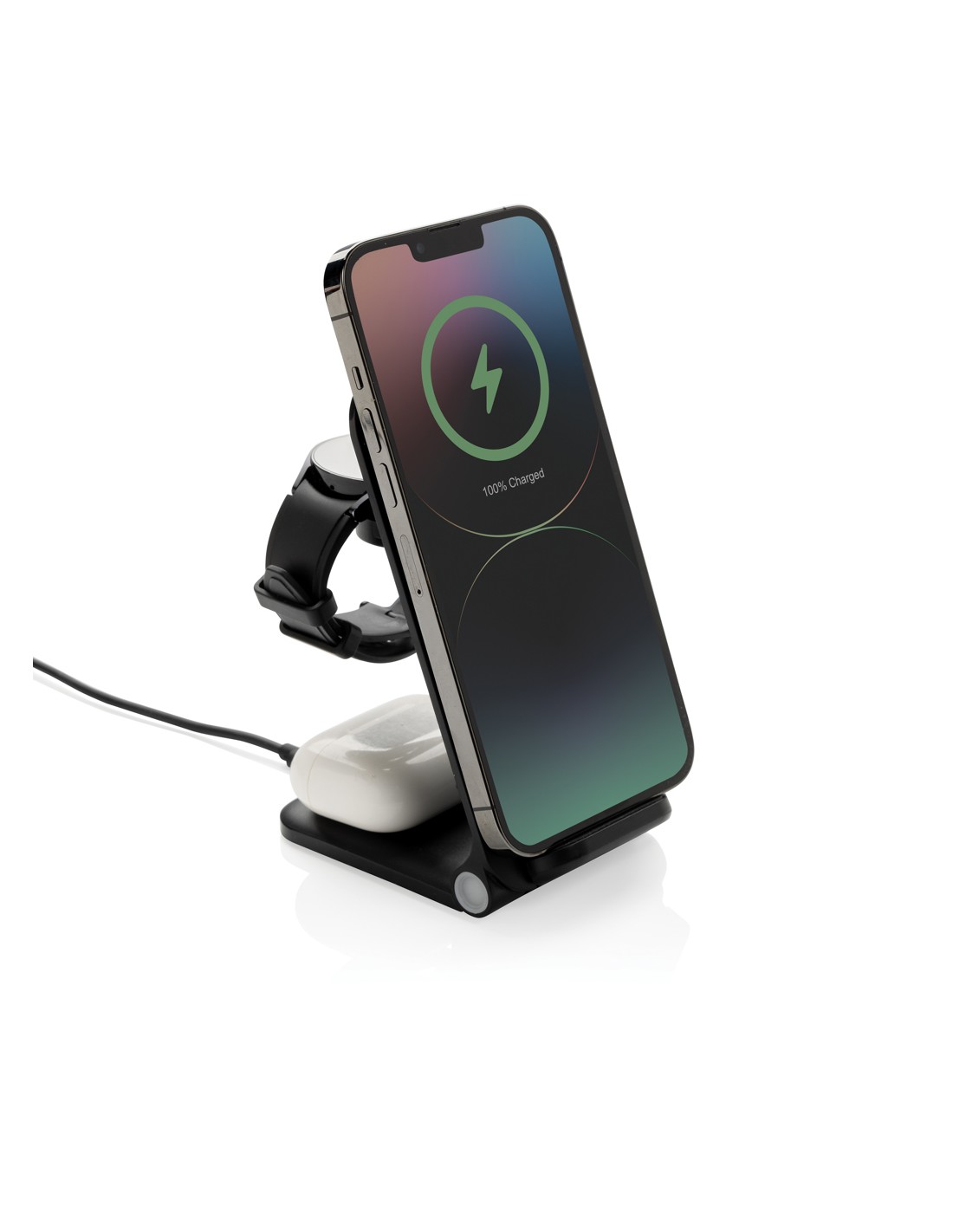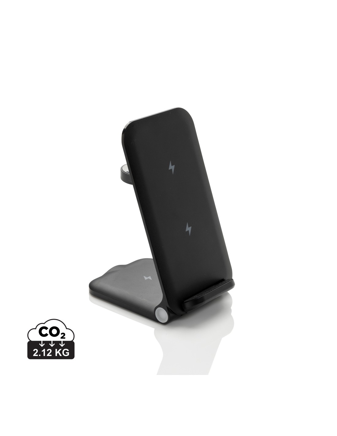 Supporto per caricabatterie wireless 3 in 1 realizzato con ABS riciclato RCS. Contenuto riciclato totale: 51% in base al peso totale dell'articolo. La certificazione RCS garantisce una catena di approvvigionamento completamente certificata dei materiali riciclati. E' dotato di un caricatore wireless da 15W e di un caricatore wireless aggiuntivo da 5W adatto alle custodie degli auricolari o ad altri piccoli dispositivi ricaricabili senza fili e di un caricatore wireless da 2,5W per gli smartwatch (solo per gli orologi Apple). Design pieghevole, facile da portare con sé. Include un cavo in TPE riciclato da 120 cm certificato RCS. Confezionato in scatola kraft misto FSC®. Articolo e accessori 100% privi di PVC. Input: 9V/3A per un utilizzo ottimale. Output: Telefono: 9V/1.1A; 9V/1.67 A/(15W), Auricolari: 5V/1A (5W), Orologio: 5V/0,5A.