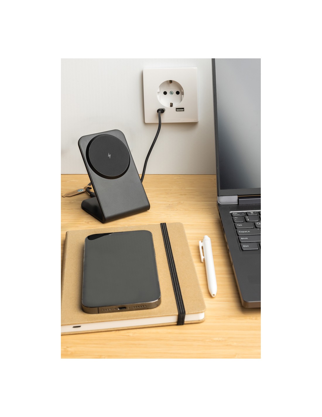 Il caricatore wireless magnetico VoltPerch offre una ricarica perfetta con una potenza di 15W e una solida presa magnetica per i dispositivi mobili. I suoi 15 magneti di alta qualità garantiscono un allineamento perfetto per una ricarica efficiente, sia in posizione orizzontale che verticale. I piedini in silicone sulla base assicurano stabilità su qualsiasi superficie, mentre un indicatore di ricarica integrato ti tiene informato sullo stato della batteria. Struttura in ABS riciclato certificato RCS. RCS (Recycled Claim Standard) è uno standard per la verifica del contenuto riciclato di un prodotto lungo tutta la catena di approvvigionamento. Contenuto totale riciclato: 47% rispetto al peso totale del prodotto. E' privo di PVC e confezionato in una scatola kraft certificata FSC. Il supporto include un cavo type C a type C da 120 cm realizzato in TPE riciclato certificato RCS. Input type C: 9V/2,22A.