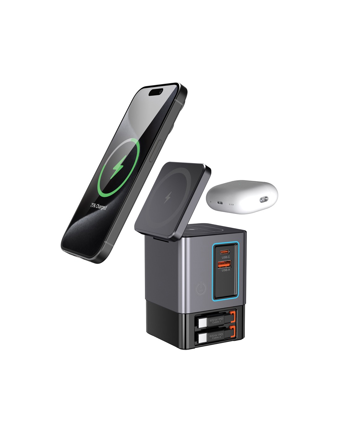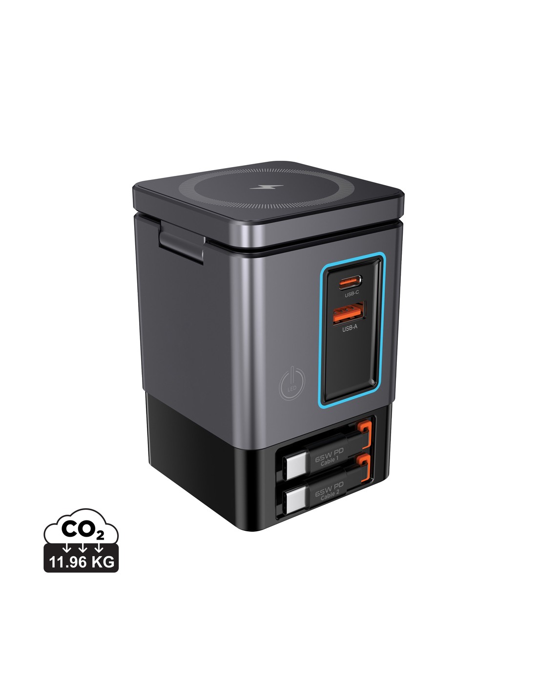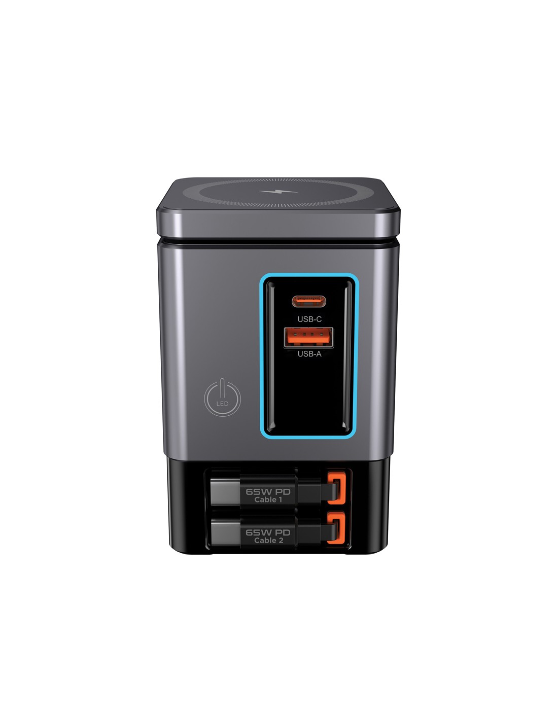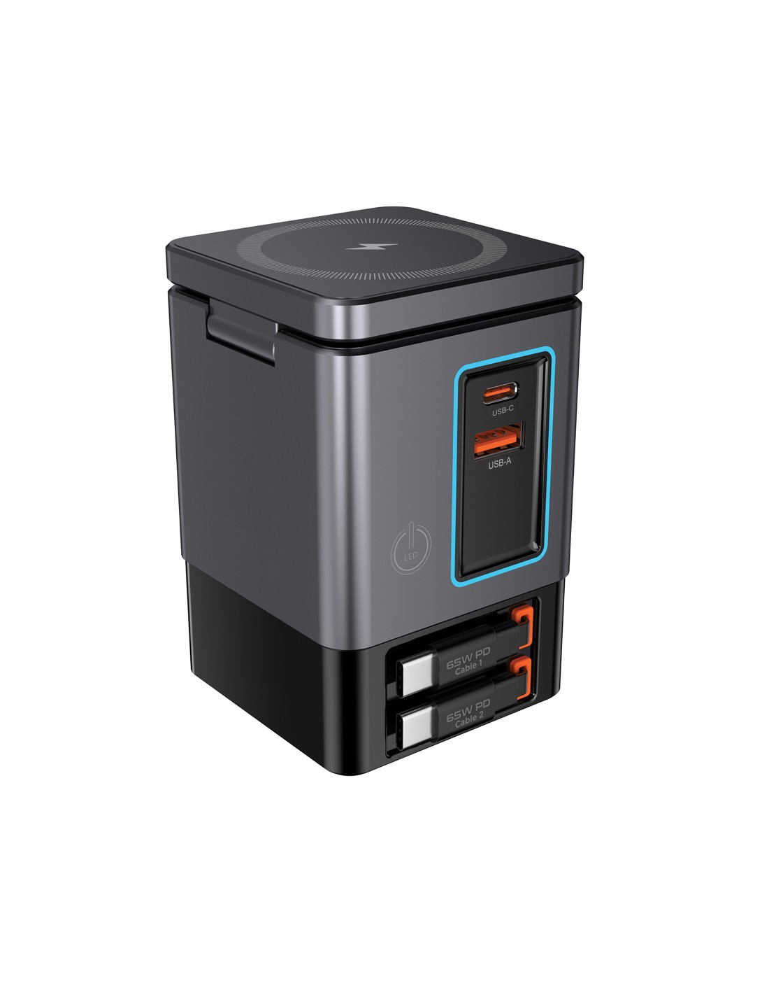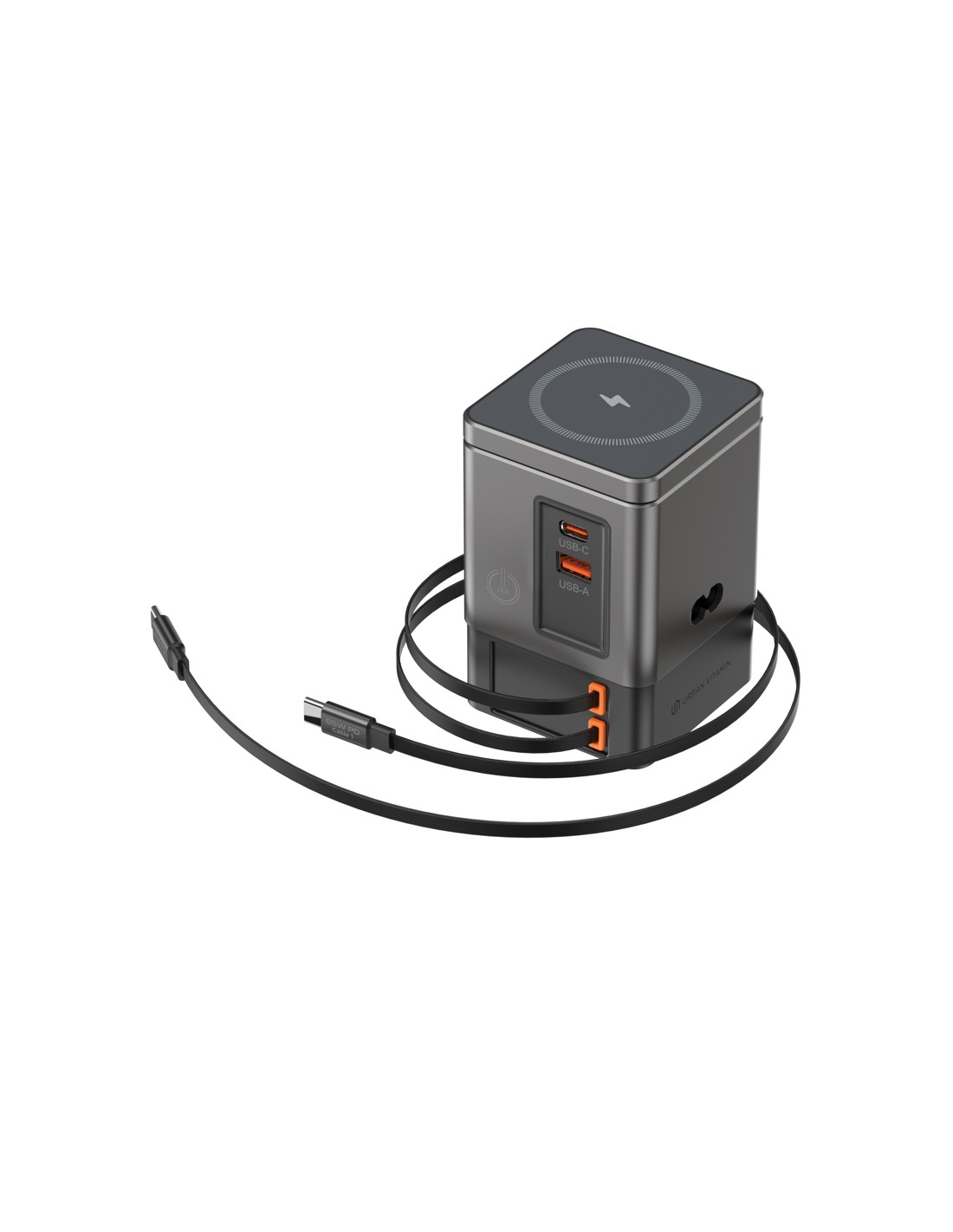 La soluzione di ricarica all-in-one che stavi aspettando. Sacramento è una stazione di ricarica GaN da 105W che combina la massima potenza con la praticità integrata. È dotato di due cavi type C retrattili da 65W integrati, così avrai sempre a portata di mano una ricarica rapida, senza bisogno di cavi aggiuntivi. Hai bisogno di più opzioni? Sacramento include anche una porta USB A e una type C, per un totale di quattro opzioni di output per ricaricare laptop, tablet, smartphone e altro ancora, tutto contemporaneamente. E per i tuoi dispositivi wireless, Sacramento è dotato di un potente caricabatterie wireless magnetico da 15W che mantiene il tuo telefono saldamente in posizione, oltre a un pad wireless separato progettato specificamente per oggetti più piccoli come auricolari o AirPods (5W max). Sacramento offre prestazioni elevate con un design compatto ed efficiente, generando meno calore e utilizzando l'energia in modo più efficiente rispetto ai caricabatterie tradizionali. Sacrame