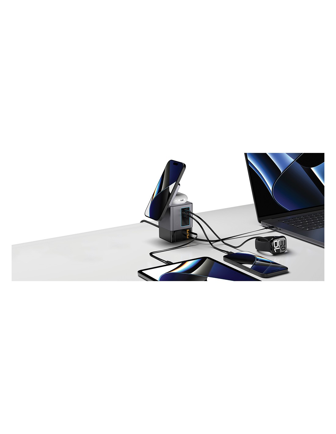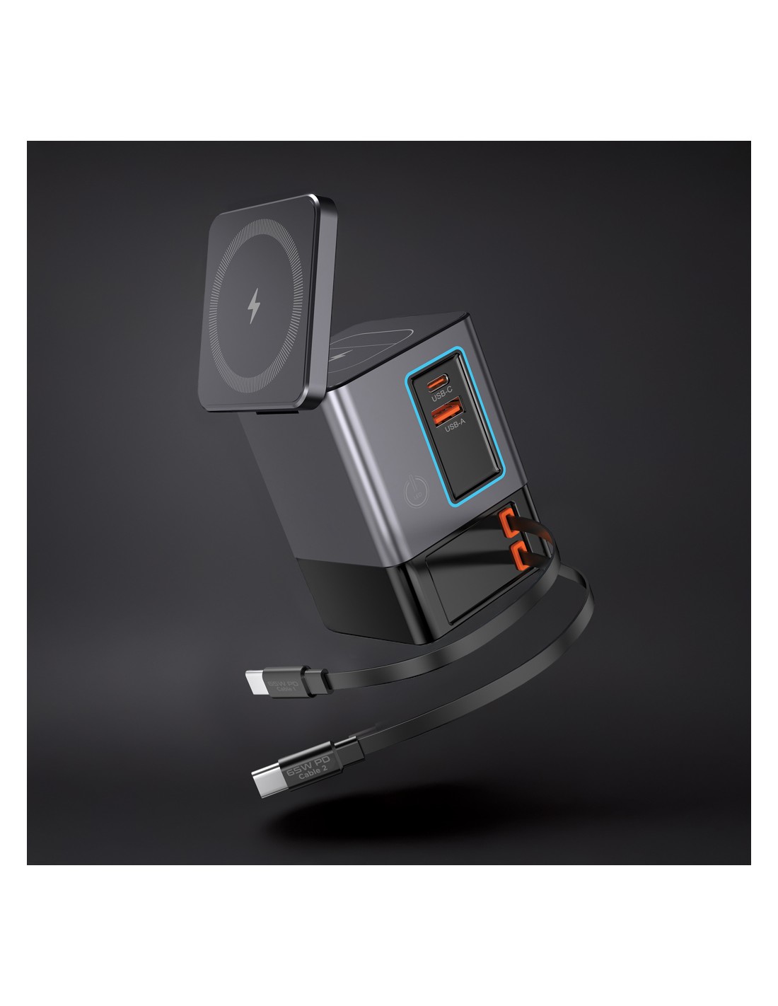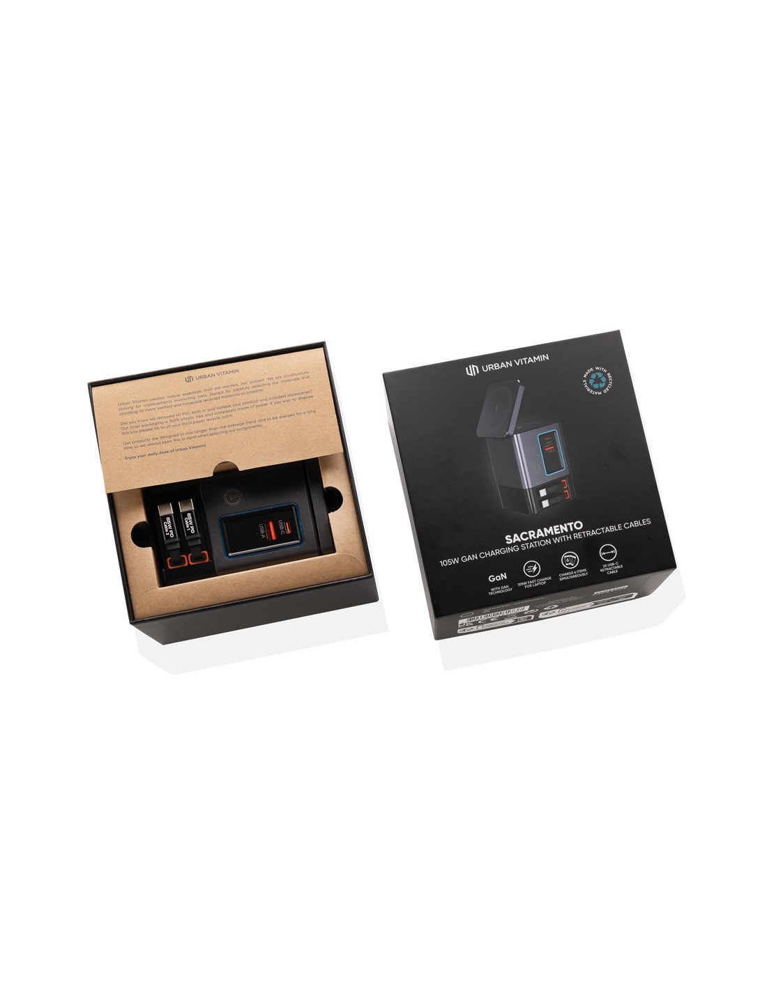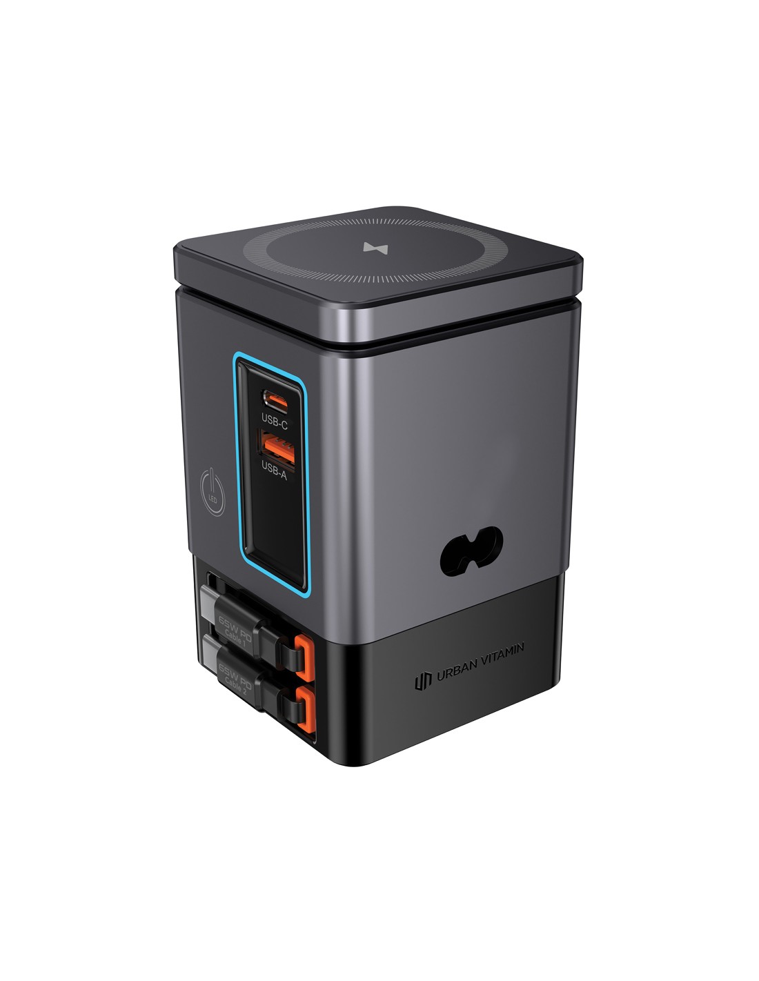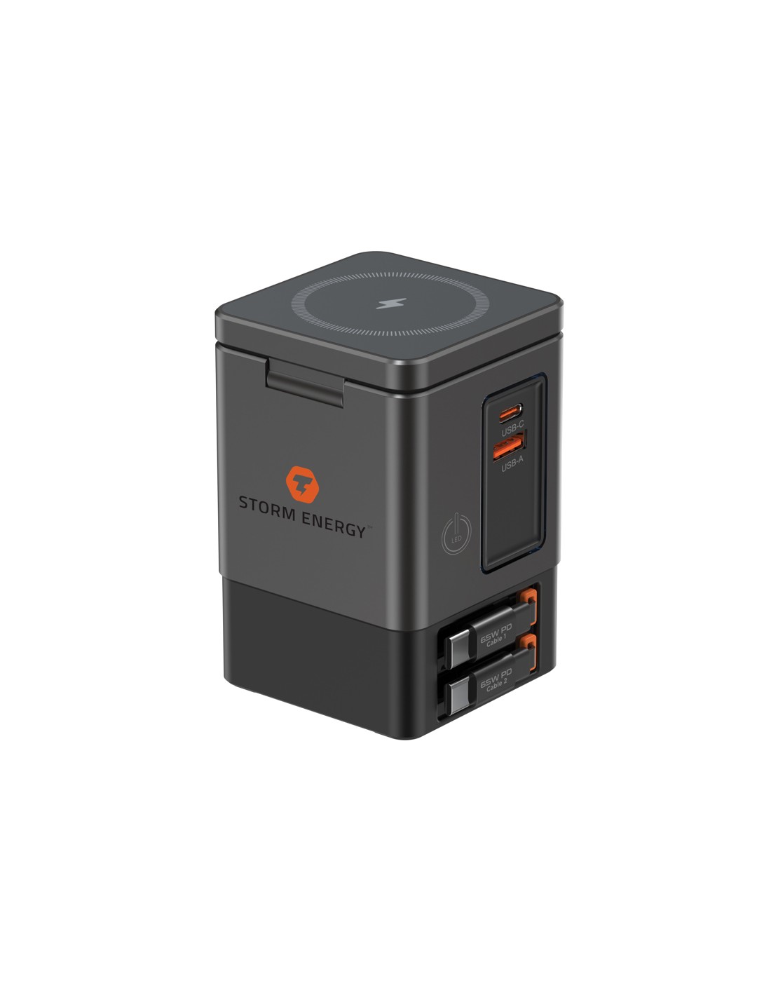 La soluzione di ricarica all-in-one che stavi aspettando. Sacramento è una stazione di ricarica GaN da 105W che combina la massima potenza con la praticità integrata. È dotato di due cavi type C retrattili da 65W integrati, così avrai sempre a portata di mano una ricarica rapida, senza bisogno di cavi aggiuntivi. Hai bisogno di più opzioni? Sacramento include anche una porta USB A e una type C, per un totale di quattro opzioni di output per ricaricare laptop, tablet, smartphone e altro ancora, tutto contemporaneamente. E per i tuoi dispositivi wireless, Sacramento è dotato di un potente caricabatterie wireless magnetico da 15W che mantiene il tuo telefono saldamente in posizione, oltre a un pad wireless separato progettato specificamente per oggetti più piccoli come auricolari o AirPods (5W max). Sacramento offre prestazioni elevate con un design compatto ed efficiente, generando meno calore e utilizzando l'energia in modo più efficiente rispetto ai caricabatterie tradizionali. Sacrame