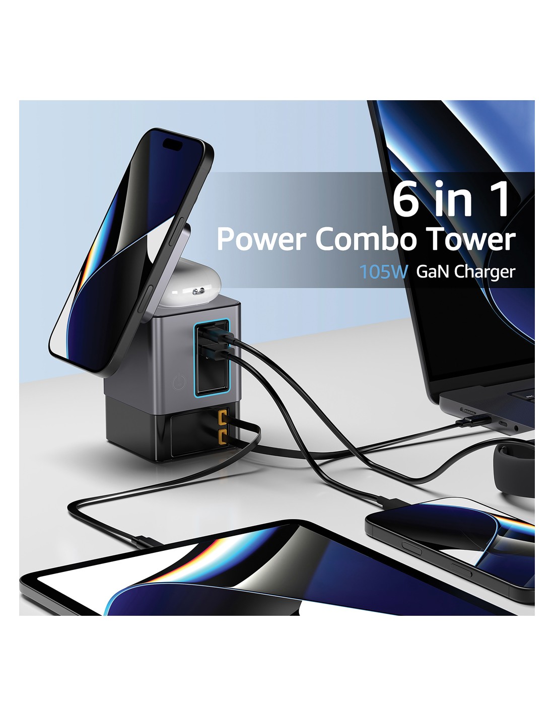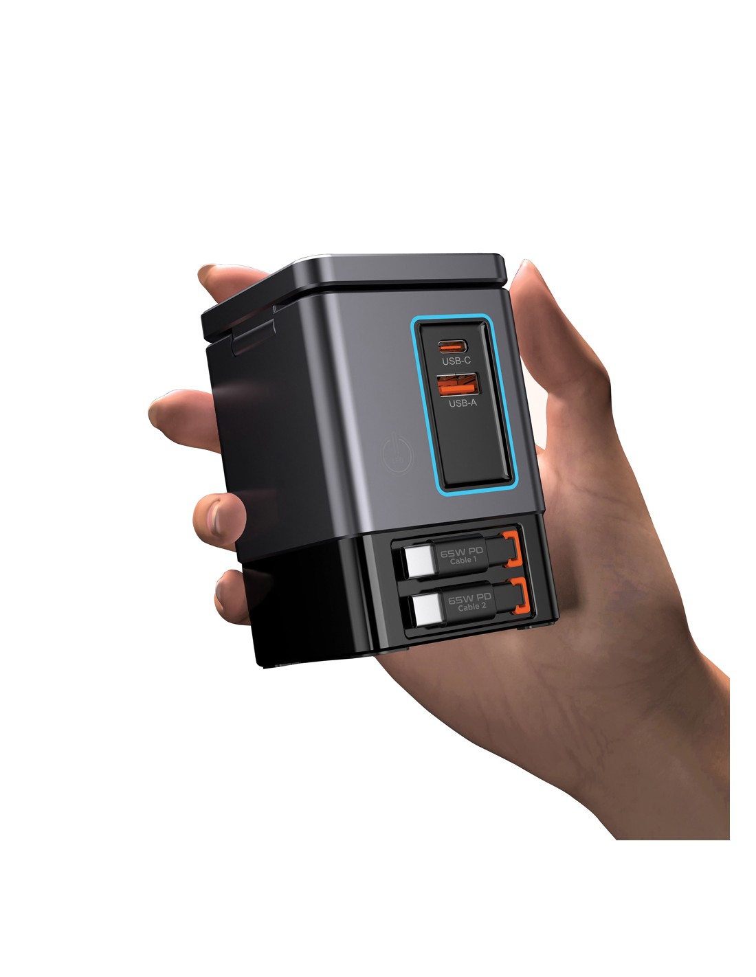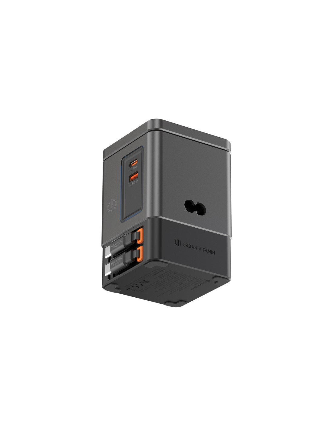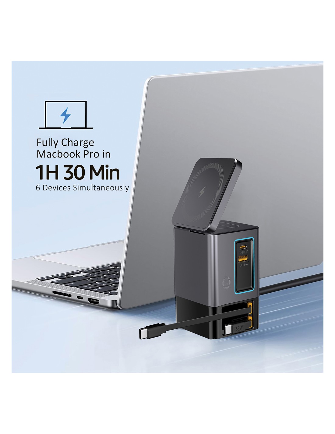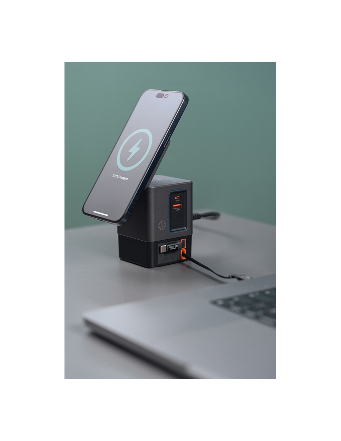 La soluzione di ricarica all-in-one che stavi aspettando. Sacramento è una stazione di ricarica GaN da 105W che combina la massima potenza con la praticità integrata. È dotato di due cavi type C retrattili da 65W integrati, così avrai sempre a portata di mano una ricarica rapida, senza bisogno di cavi aggiuntivi. Hai bisogno di più opzioni? Sacramento include anche una porta USB A e una type C, per un totale di quattro opzioni di output per ricaricare laptop, tablet, smartphone e altro ancora, tutto contemporaneamente. E per i tuoi dispositivi wireless, Sacramento è dotato di un potente caricabatterie wireless magnetico da 15W che mantiene il tuo telefono saldamente in posizione, oltre a un pad wireless separato progettato specificamente per oggetti più piccoli come auricolari o AirPods (5W max). Sacramento offre prestazioni elevate con un design compatto ed efficiente, generando meno calore e utilizzando l'energia in modo più efficiente rispetto ai caricabatterie tradizionali. Sacrame