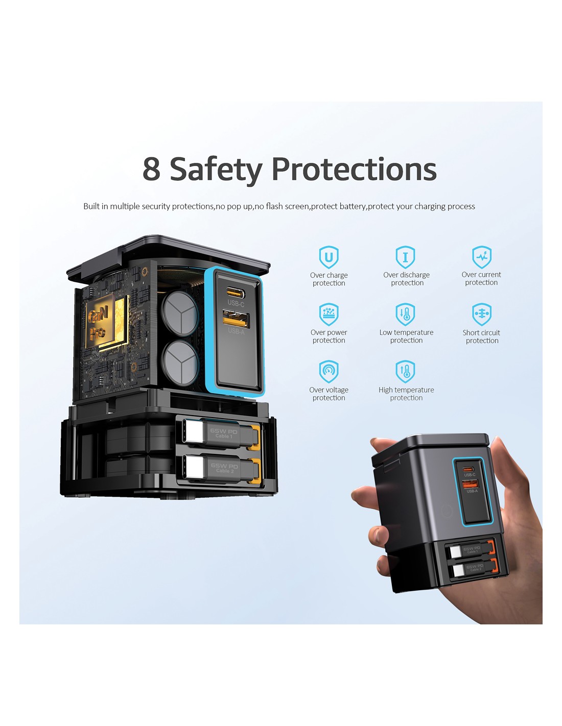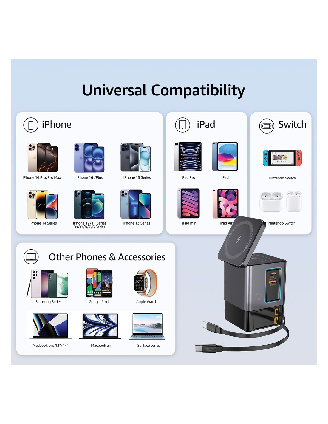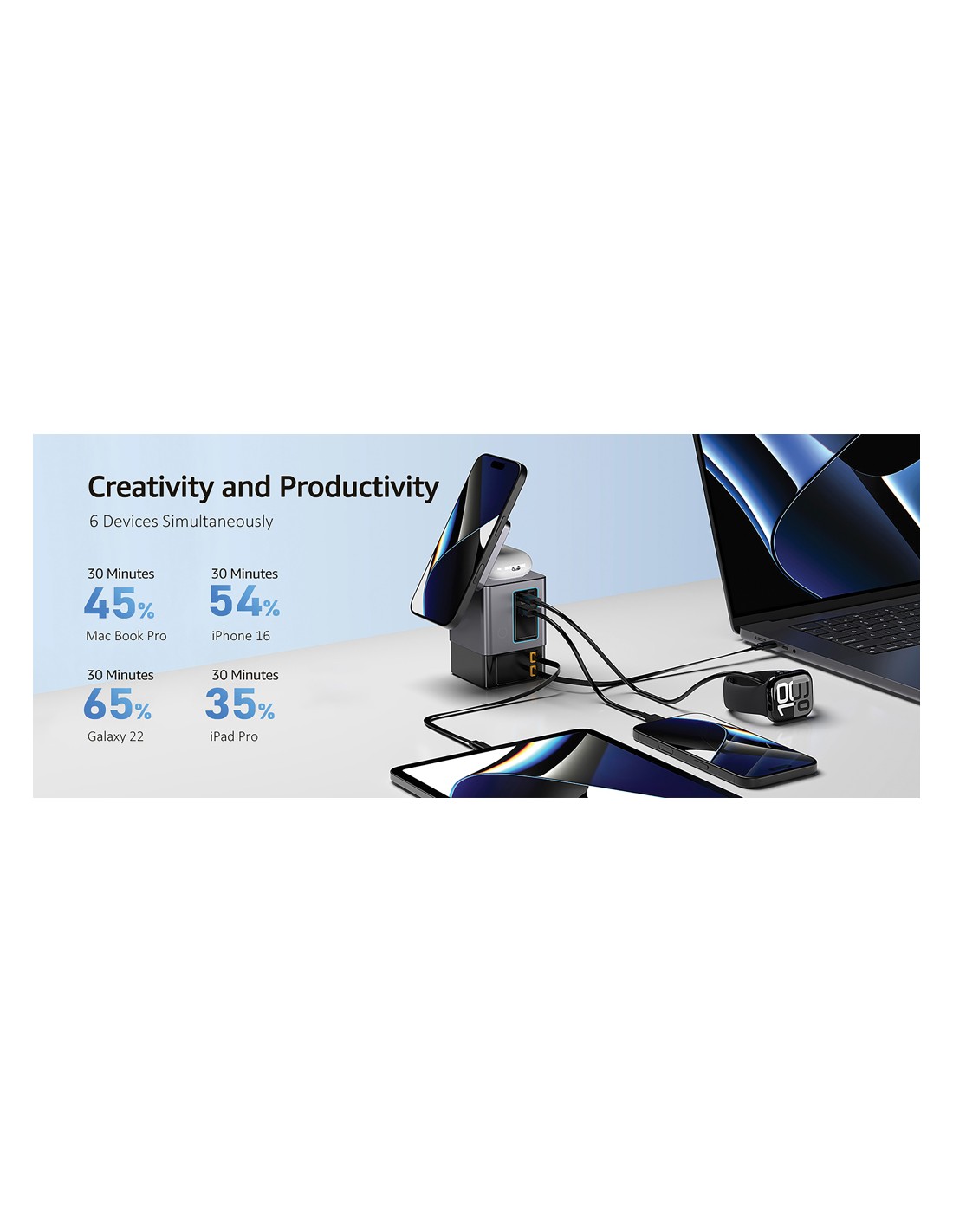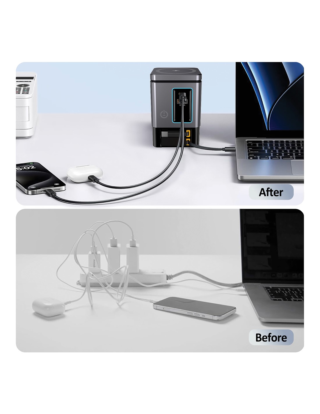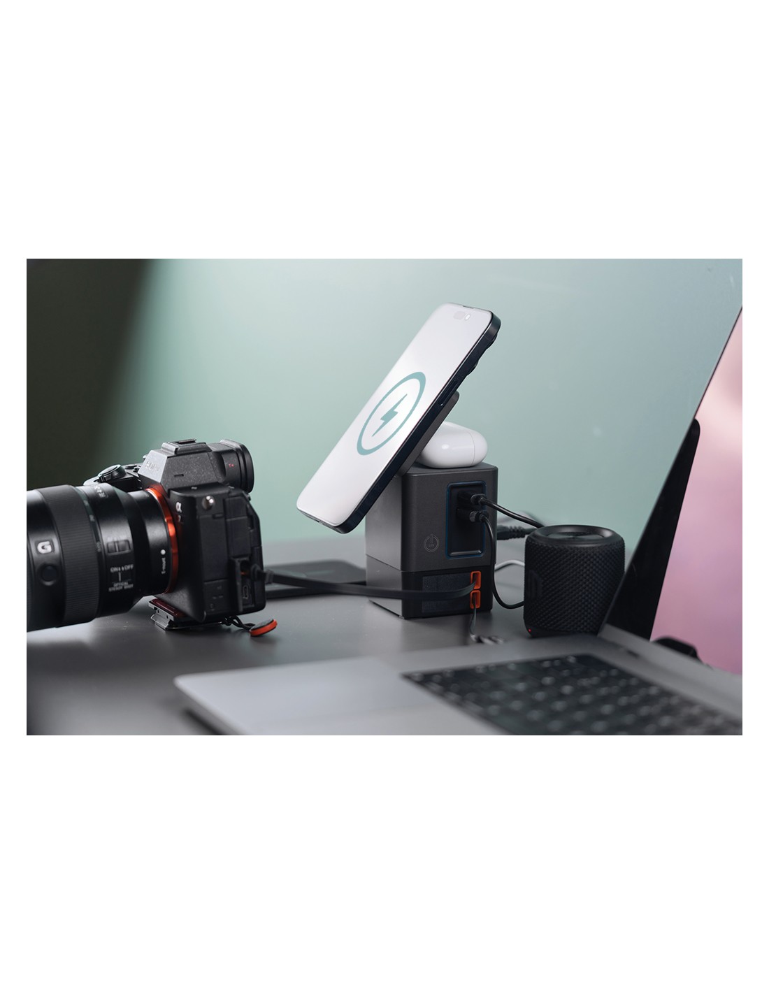 La soluzione di ricarica all-in-one che stavi aspettando. Sacramento è una stazione di ricarica GaN da 105W che combina la massima potenza con la praticità integrata. È dotato di due cavi type C retrattili da 65W integrati, così avrai sempre a portata di mano una ricarica rapida, senza bisogno di cavi aggiuntivi. Hai bisogno di più opzioni? Sacramento include anche una porta USB A e una type C, per un totale di quattro opzioni di output per ricaricare laptop, tablet, smartphone e altro ancora, tutto contemporaneamente. E per i tuoi dispositivi wireless, Sacramento è dotato di un potente caricabatterie wireless magnetico da 15W che mantiene il tuo telefono saldamente in posizione, oltre a un pad wireless separato progettato specificamente per oggetti più piccoli come auricolari o AirPods (5W max). Sacramento offre prestazioni elevate con un design compatto ed efficiente, generando meno calore e utilizzando l'energia in modo più efficiente rispetto ai caricabatterie tradizionali. Sacrame