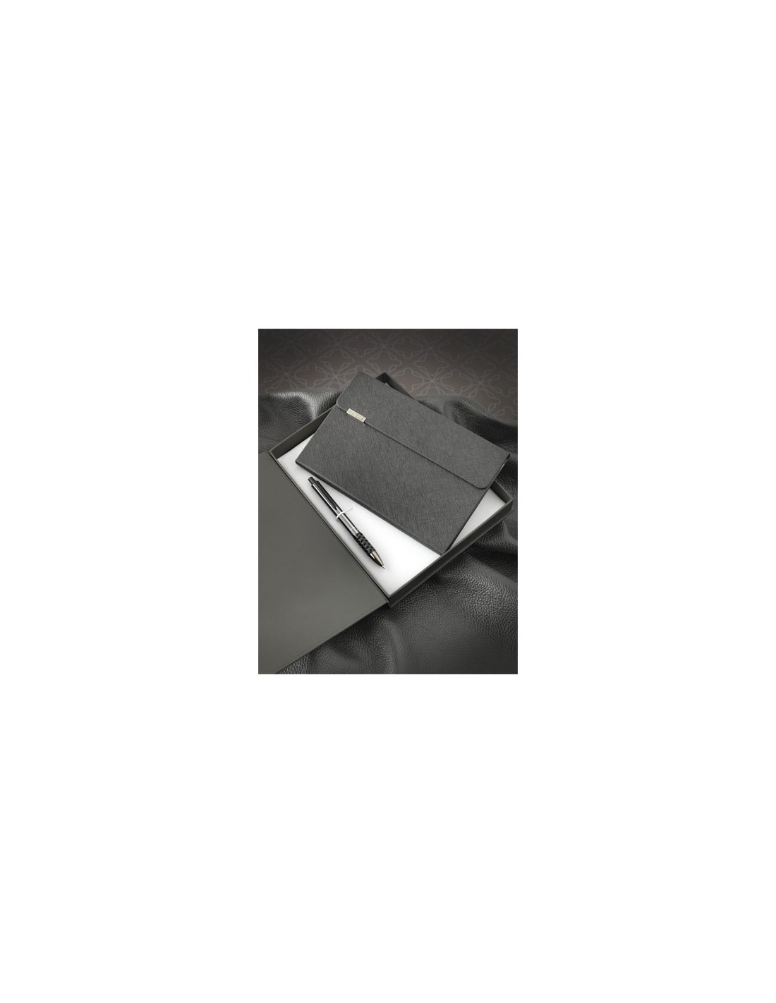 Taccuino dal design esclusivo (in formato A5) con copertina in TPU, nastro segna pagina di colore nero, chiusura magnetica e 80 fogli (80 g/m²) a righe di color crema. Accoppiato con la penna a sfera tattica a scatto. Entrambi gli articoli sono confezionati in una confezione regalo LUXE. Dimensioni del taccuino: 13,5 x 20,5 cm. Lunghezza della penna: 14 cm. Diametro della penna: 1,05 cm.