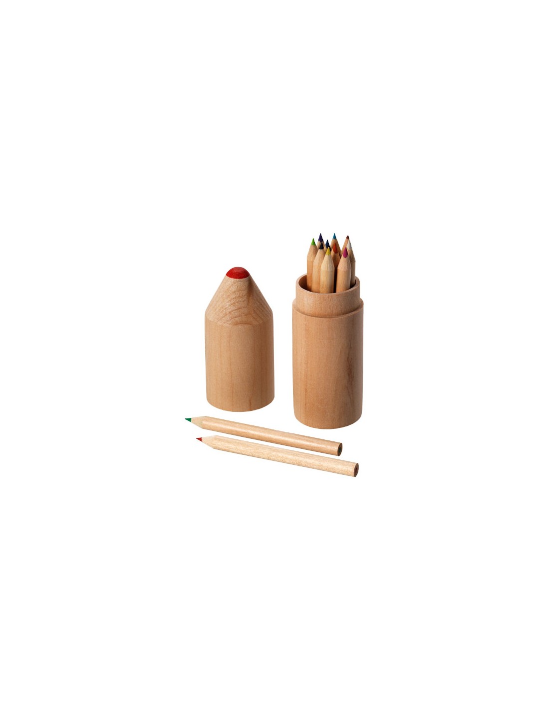 12 matite colorate in confezione cilindrica di legno a forma di matita. Decorazione non disponibile sui componenti.