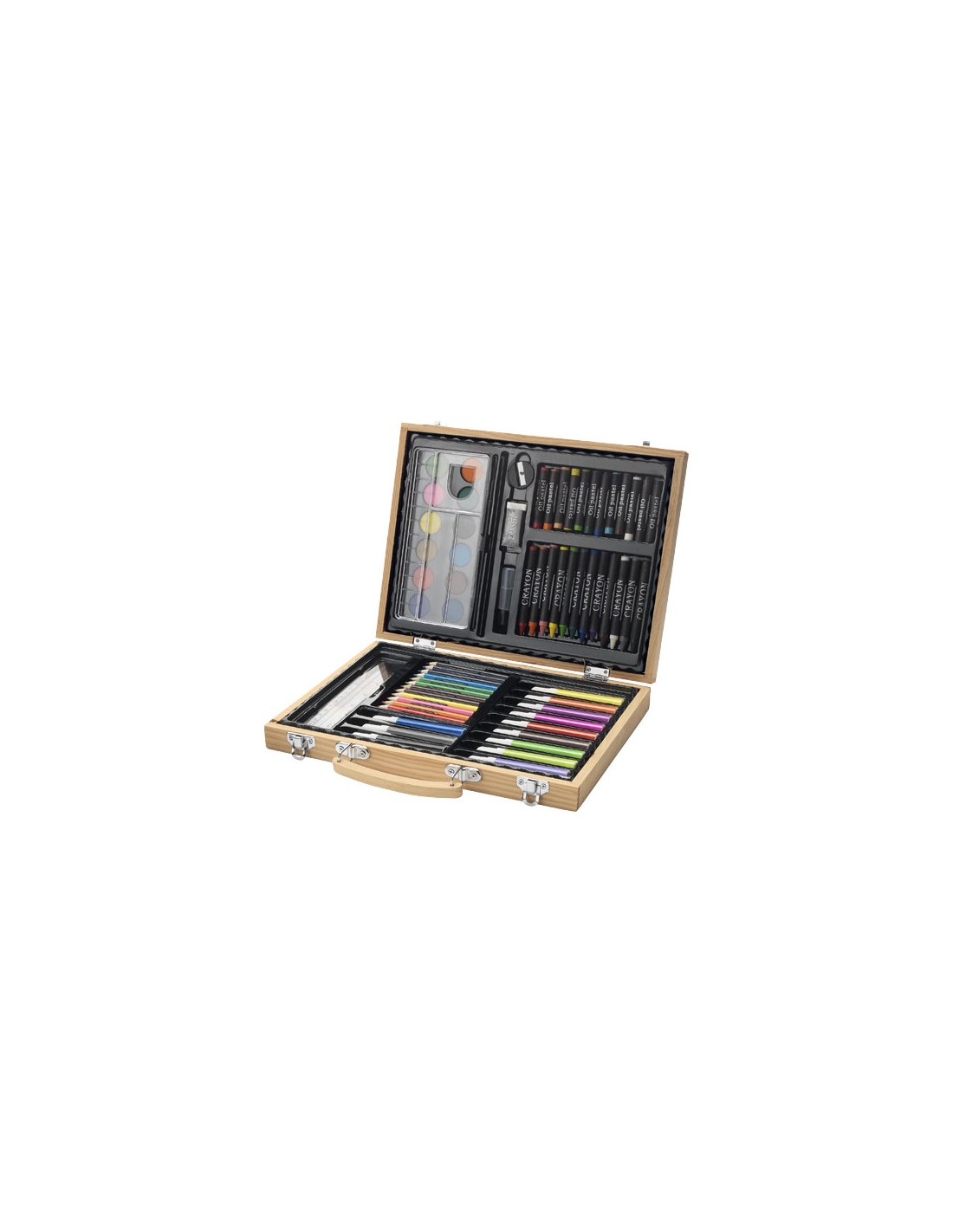 Set contenente 12 acquerelli, 12 matite colorate, 12 pennarelli, 12 pastelli ad olio, 12 pastelli a cera, tavolozza, colla, gomma per cancellare, temperamatite, matita HB e pennello, il tutto presentato in una custodia in legno. Decorazione non disponibile sui componenti. Attenzione! Non adatto a bambini di età inferiore ai tre anni. Piccole parti, rischio di soffocamento; bordo tagliente funzionale. Non deve essere ingerito. Utilizzare solo sotto la supervisione di un adulto.