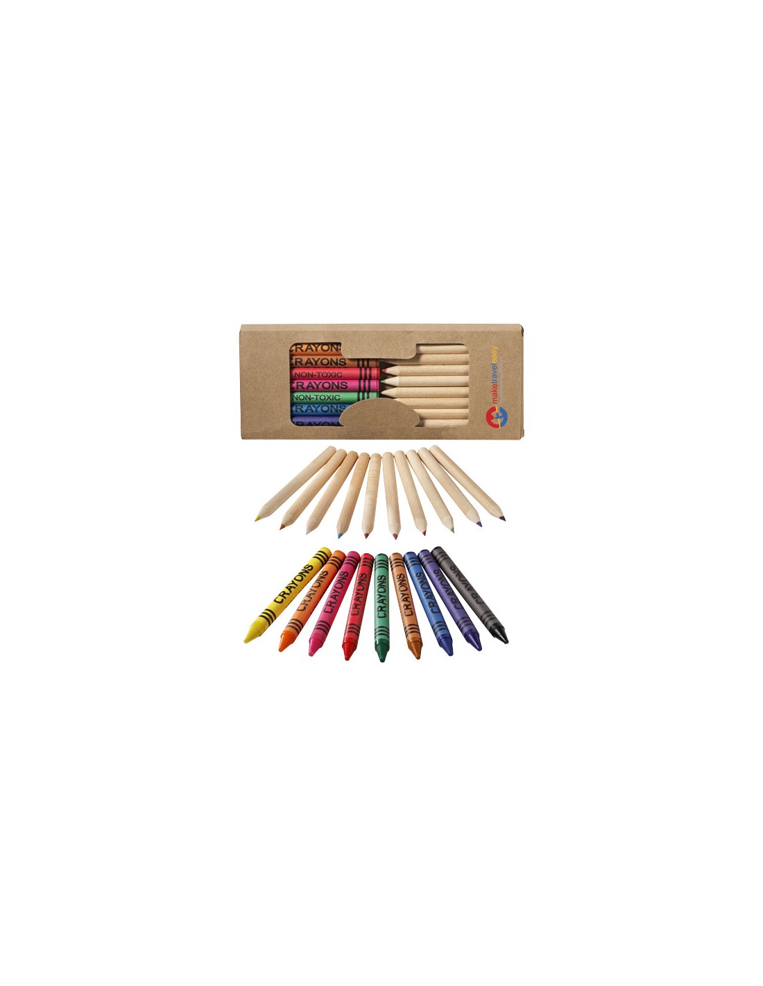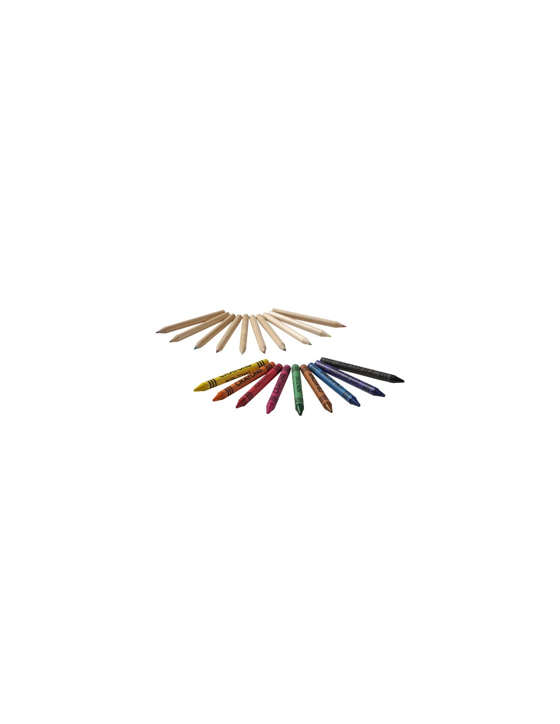 9 pastelli a cera colorati e 10 matite colorate in una scatola di cartone con finestra di plastica. Decorazione non disponibile sui componenti.