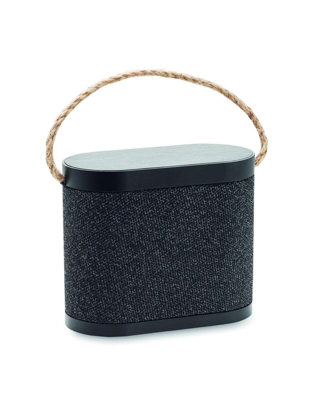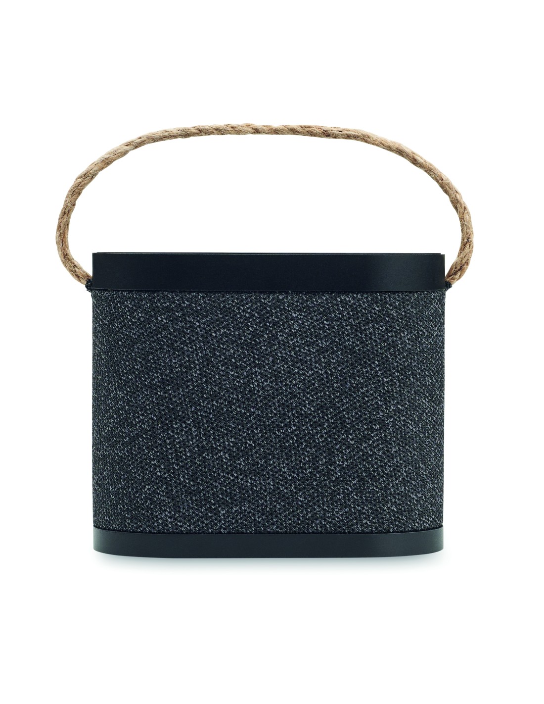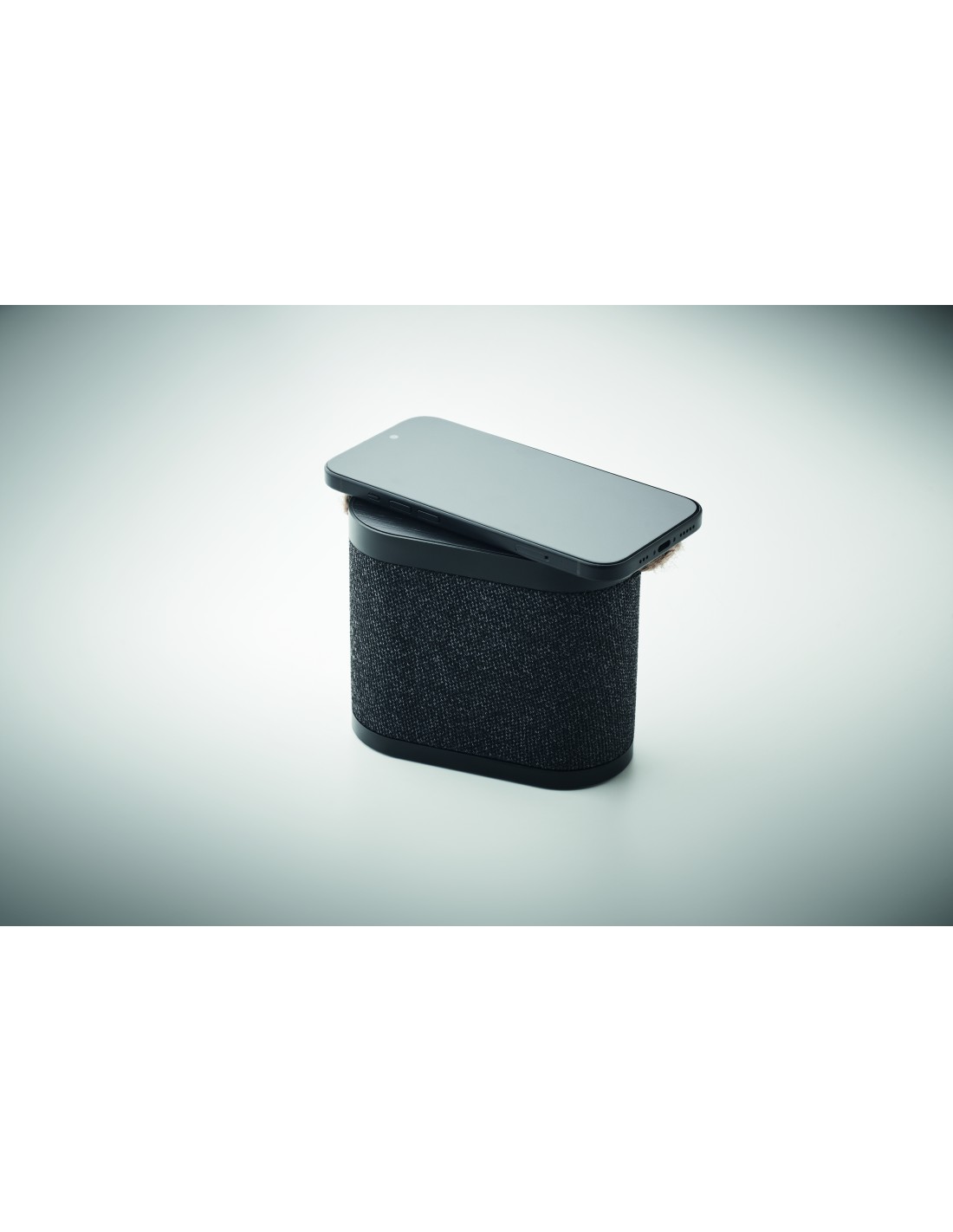 5.3 speaker wireless in ABS con finitura in tessuto poliestere RPET e caricatore wireless da 15W in bamboo, con maniglia in iuta. 1 batteria ricaricabile agli ioni di litio da 1200 mAh. Dati di uscita: 5W, 4 Ohm e 5V. Tempo di riproduzione di circa 4 ore.