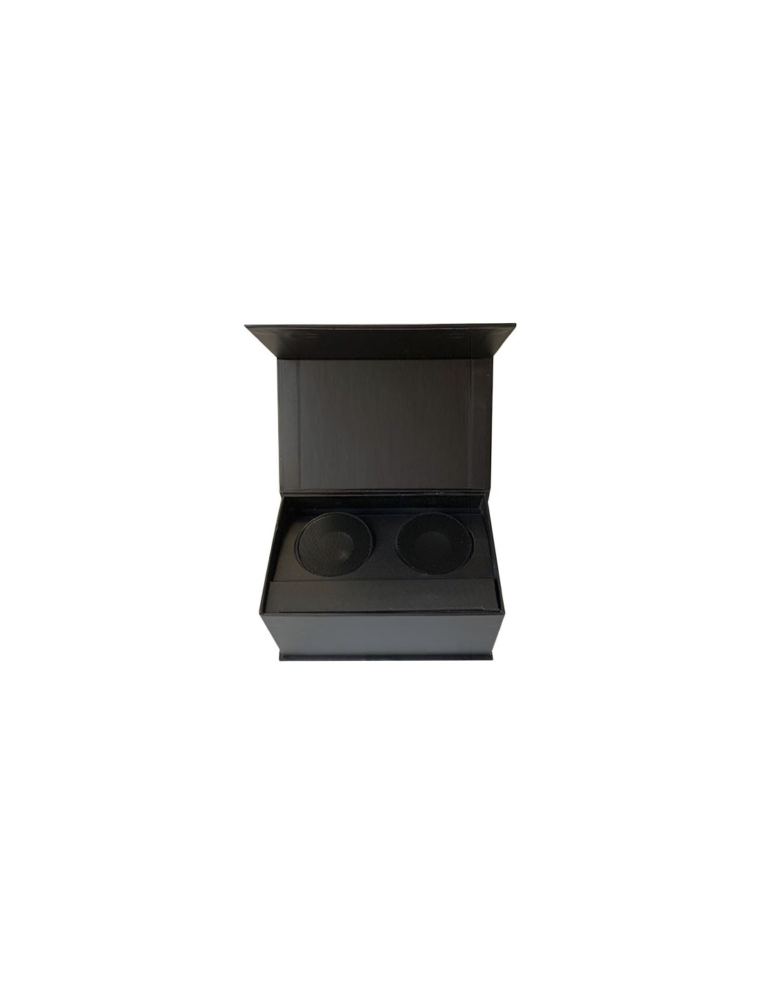 Base con 2 speaker da 3 W con logo luminoso, dotata di microfono integrato e funzione di chiamata in conferenza. Gli speaker possono essere accoppiati per creare un suono stereo e ricaricati senza fili quando posizionati sulla base. Capacità: 3,7 V/500 mAh. Frequenza: 120 Hz - 16 kHz. Uscita: 2 x 3 W. Ingresso: 5 W. Bluetooth® 4.2. Peso netto: 100 grammi. Dimensione: ∅ 50 x 46,5 mm. Forniti in una confezione regalo con chiusura magnetica, realizzata in carta riciclata.