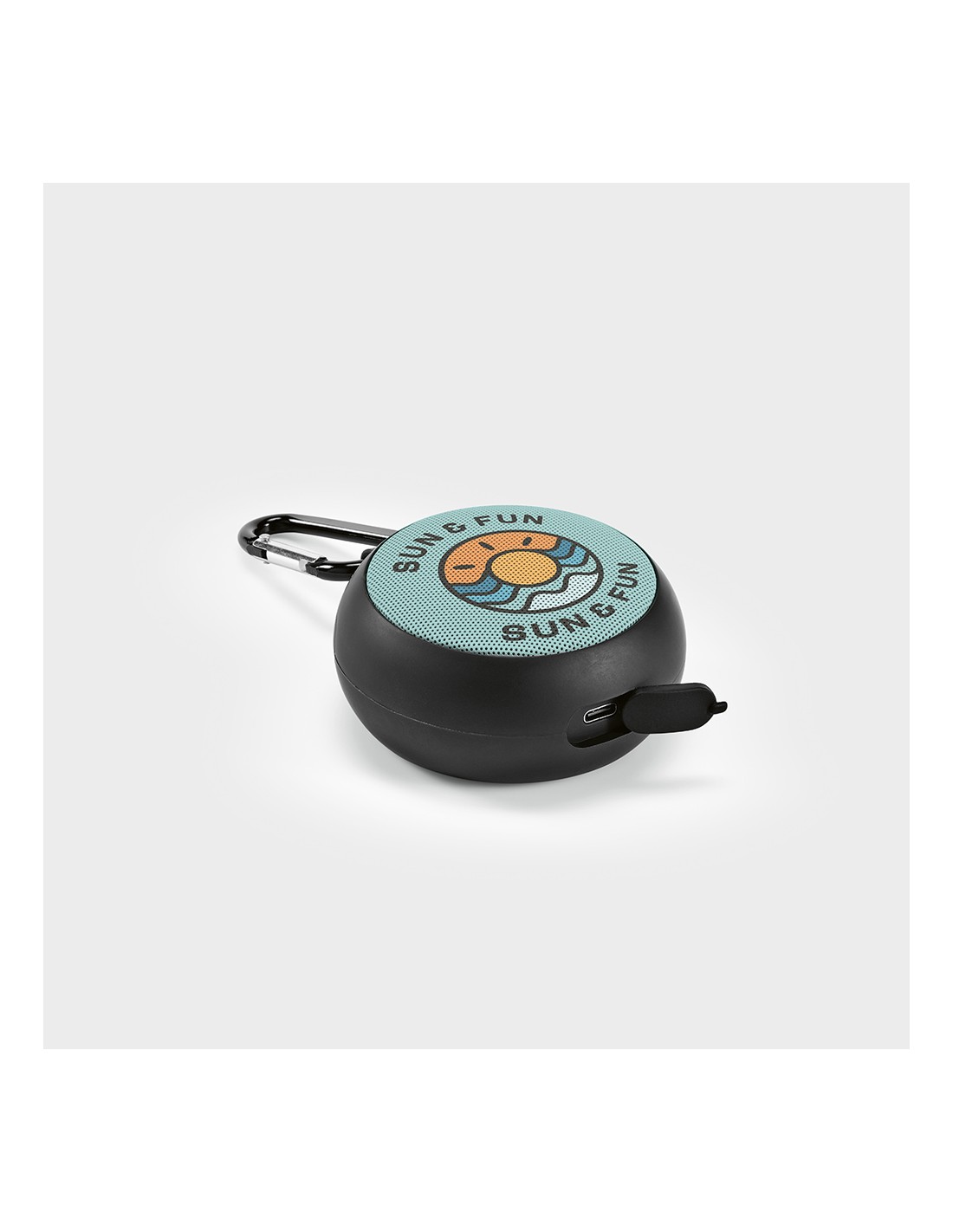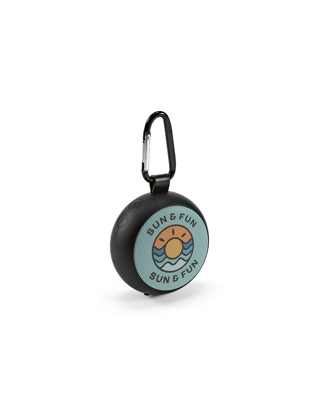 Darwin è uno speaker da 5W realizzato in ABS riciclato, dotato di una batteria da 3,7V 1000mAh che garantisce un'autonomia di 1,5 ore. Il tempo di ricarica è di circa 2 ore tramite connessione USB-C. Include un moschettone che consente di appenderlo o trasportarlo con facilità. La griglia in metallo permette una personalizzazione a colori totali. Offre una protezione impermeabile con certificazione IPX5. Confezionato singolarmente in scatola kraft.