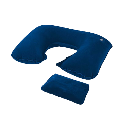Morbido set da viaggio contenente un cuscino gonfiabile per il collo con cerniera azzurra, una mascherina per gli occhi con elastico azzurro e tappi per le orecchie azzurri, il tutto presentato in una morbida custodia con coulisse azzurra.