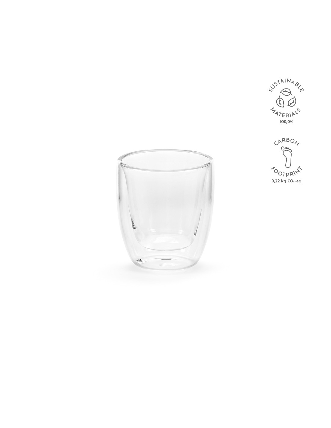 Tazza Meuse 75 ideale per espresso, senza manico, in vetro borosilicato con capacità di 70ml (60ml netti). La doppia parete mantiene il caffè caldo al primo sorso. Confezionata singolarmente in scatola kraft.