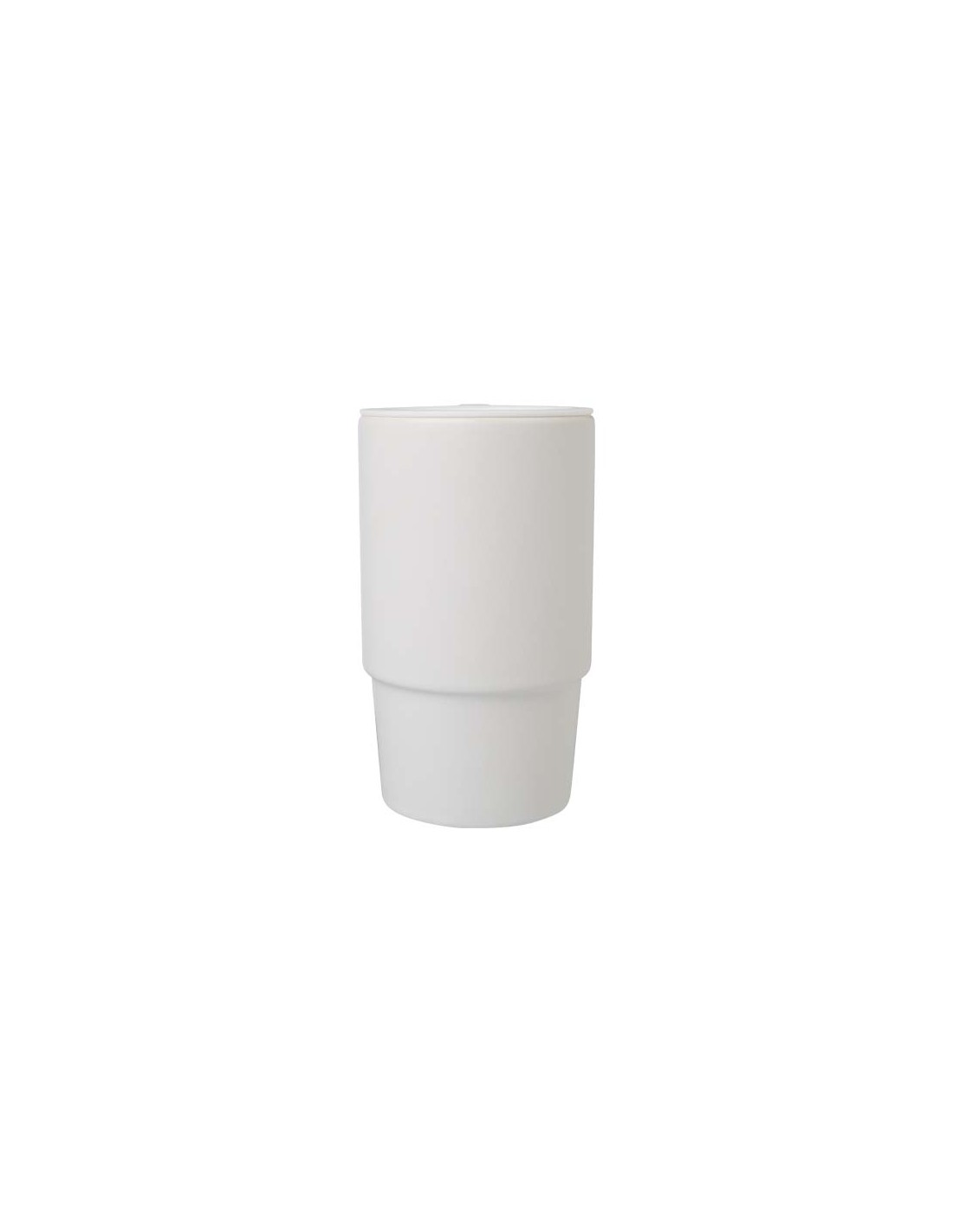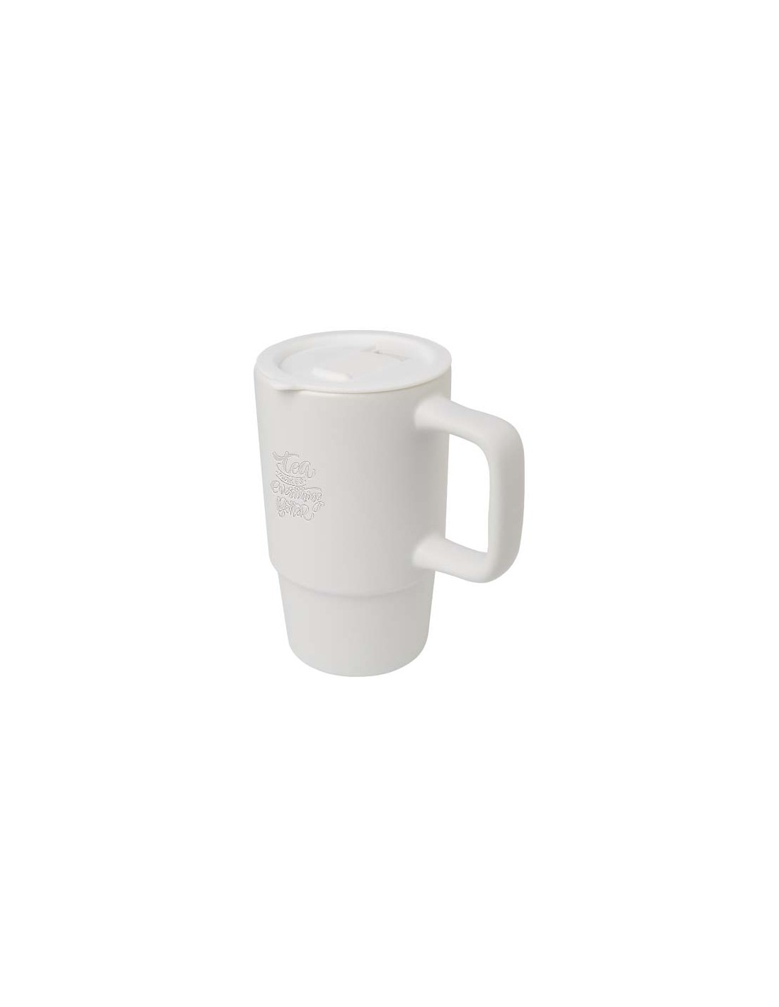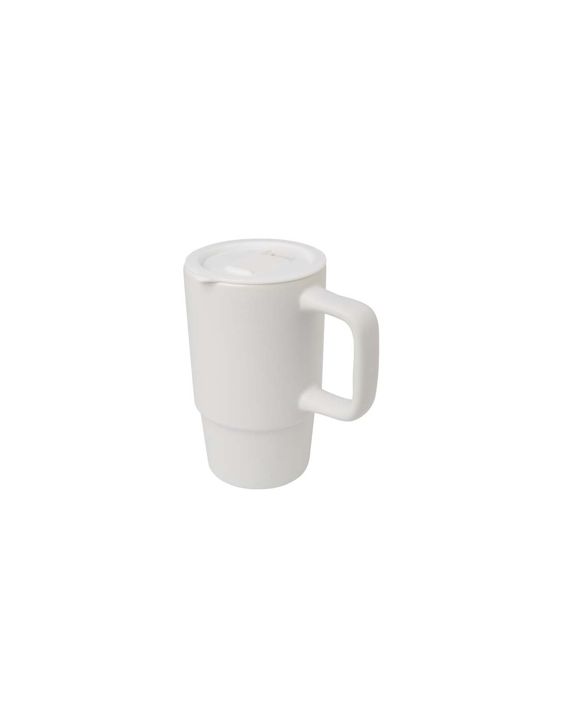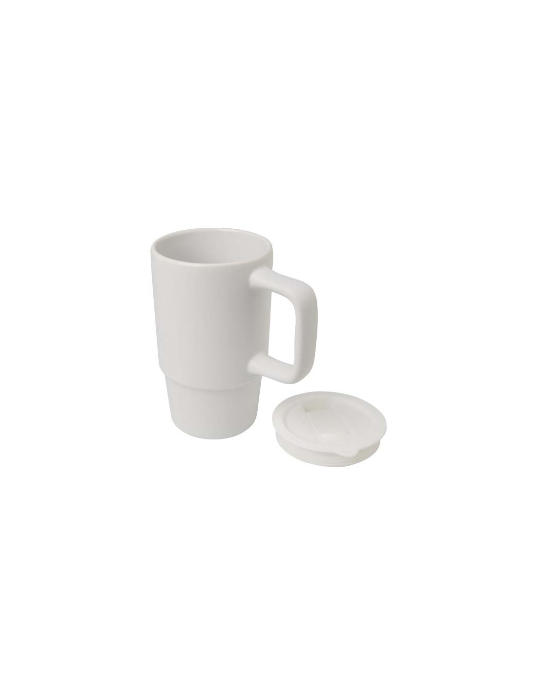 Tazza in ceramica caratterizzata da un grande manico per trasportarla in modo semplice e da un coperchio di plastica ermetico per una maggiore praticità durante gli spostamenti. L'esterno presenta un elegante finitura opaca ed è lavabile in lavastoviglie con qualsiasi metodo di stampa. Fornita in una confezione regalo in cartone riciclato. Capacità: 450 ml.