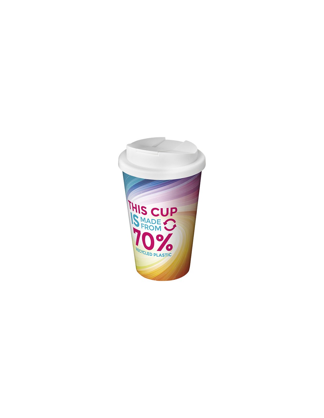 Bicchiere termico a doppia parete con coperchio ermetico twist e una decorazione a colori stampata su tutto il prodotto. Realizzato in materiale riciclato al 70% (bicchiere riciclato e interno nero), con un coperchio in plastica PP standard. Il bicchiere è completamente riciclabile, lavabile in lavastoviglie e adatto al forno a microonde. Capacità 350 ml e privo di BPA. Confezionato in un sacchetto idoneo al compostaggio domestico. Prodotto nel Regno Unito.