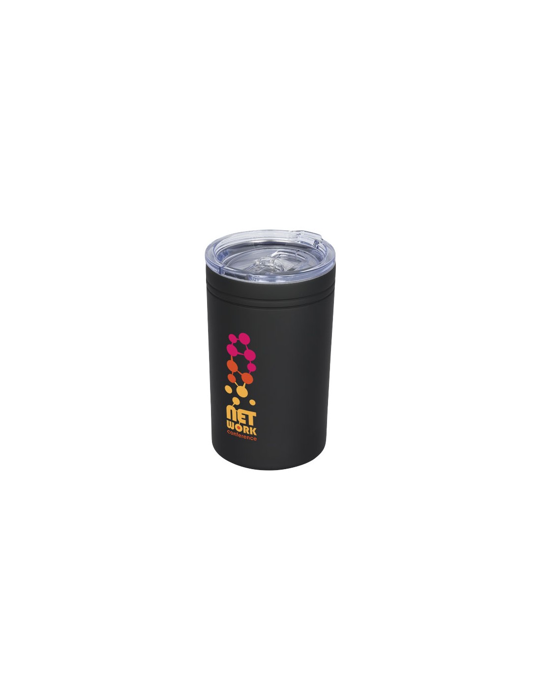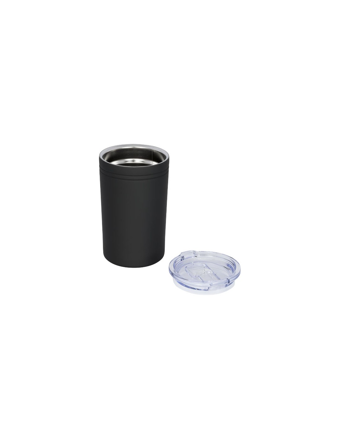 Struttura a doppia parete con isolamento sottovuoto. Tappo a pressione trasparente con apertura scorrevole. Può essere utilizzato come bicchiere o come portabevande termico. Capacità massima 330 ml.