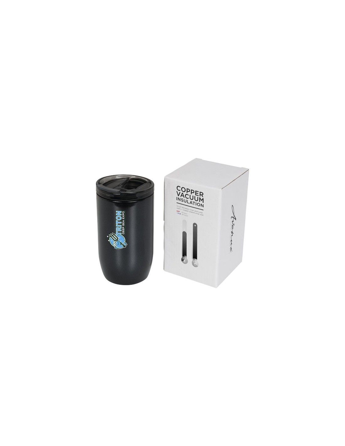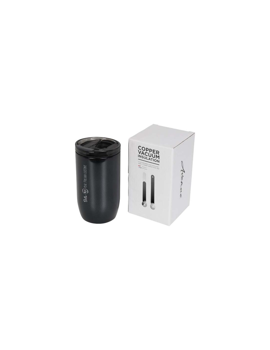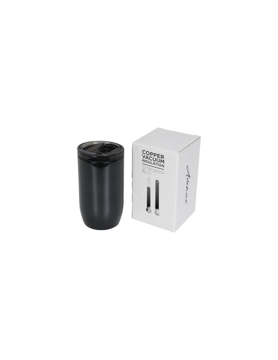 Questo bicchiere compatto e resistente è ideale per i viaggi. Il tappo è antiperdita grazie alla chiusura ermetica con apertura a scatto. Il bicchiere è dotato di una struttura sottovuoto a doppia parete in acciaio inox con isolamento in rame che mantiene le bevande al caldo per 8 ore e al fresco per 24 ore. La sua particolare struttura inoltre evita la formazione di condensa sulla superficie esterna. Capacità massima 380 ml. Presentato in confezione regalo Avenue.