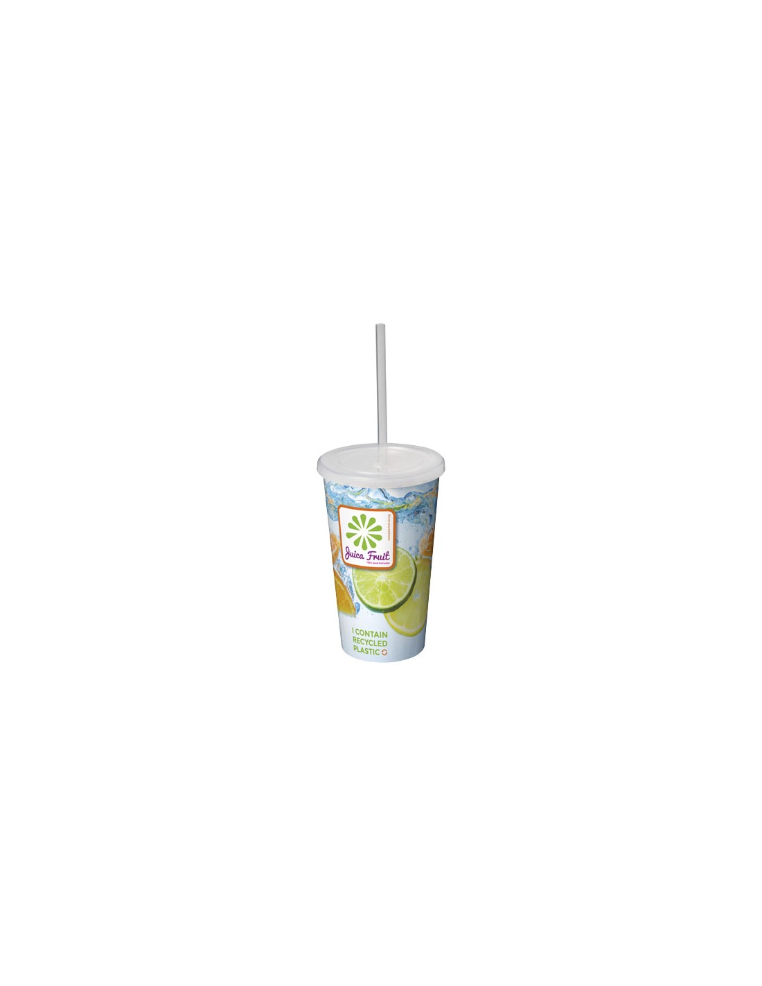 Bicchiere termico a doppia parete. Lo strato esterno del tumbler è realizzato in plastica riciclata. Bicchiere con design avvolgente a colori stampato sul prodotto, che lo rende resistente e di lunga durata. Fornito con una cannuccia in polietilene. Capacità di 350 ml. Prodotto nel Regno Unito. Confezionato in un sacchetto compostabile. Senza BPA e adatto alla lavastoviglie.