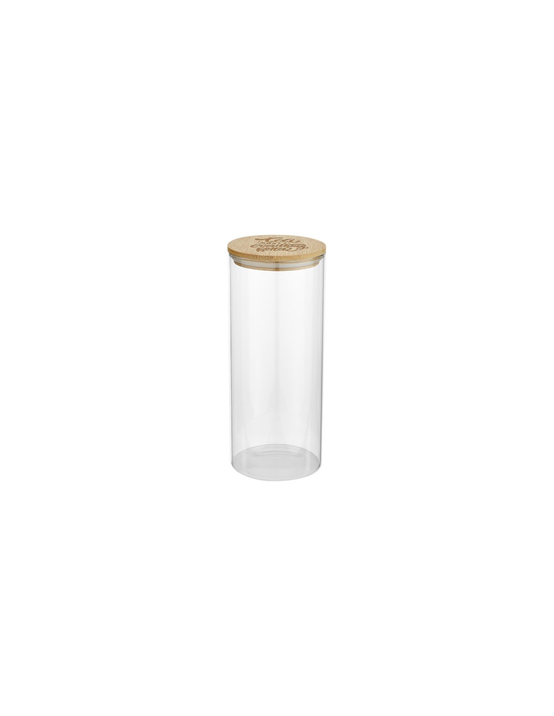 Contenitore per alimenti in vetro di grandi dimensioni con coperchio in bambù. Unisce i vantaggi del vetro, un materiale sicuro e durevole, alle caratteristiche rinnovabili del bambù. Il contenitore di vetro (senza coperchio) è adatto per il microonde e lavabile in lavastoviglie. Confezionato all'interno di una scatola in carta kraft riciclata. Capacità: 940 ml.