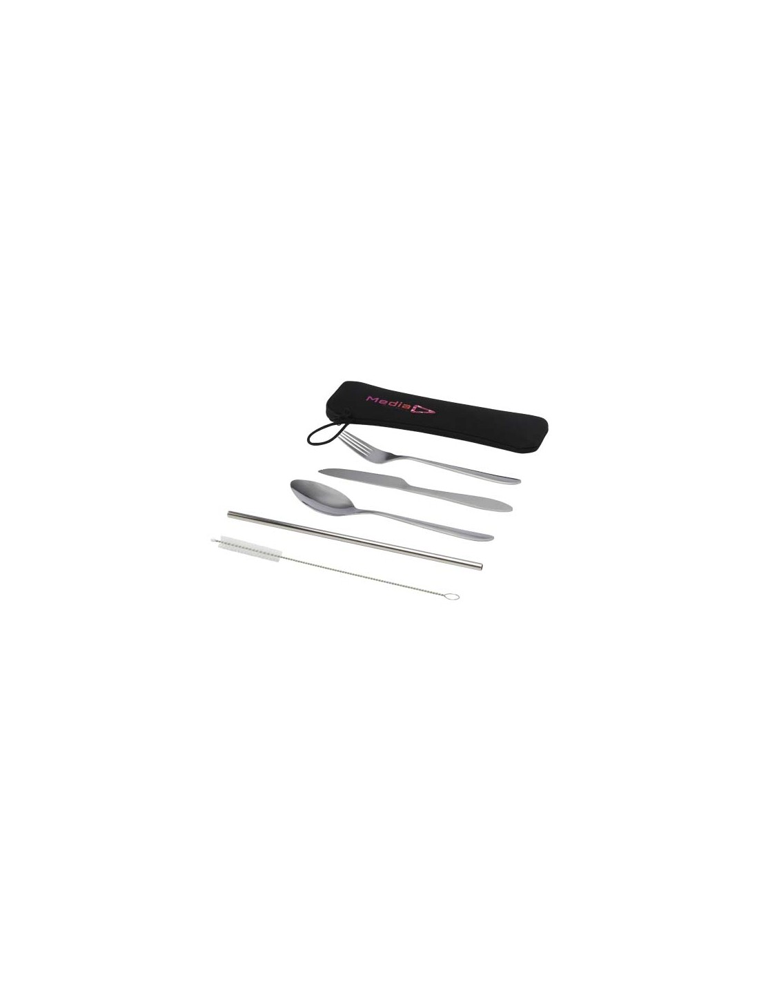Il set di posate comprendente forchetta, coltello, cucchiaio, cannuccia e spazzola per la pulizia. Le posate sono realizzate in acciaio inossidabile, resistente e facile da pulire. Fornito in una custodia in poliestere con cerniera e un comodo passante per il trasporto.