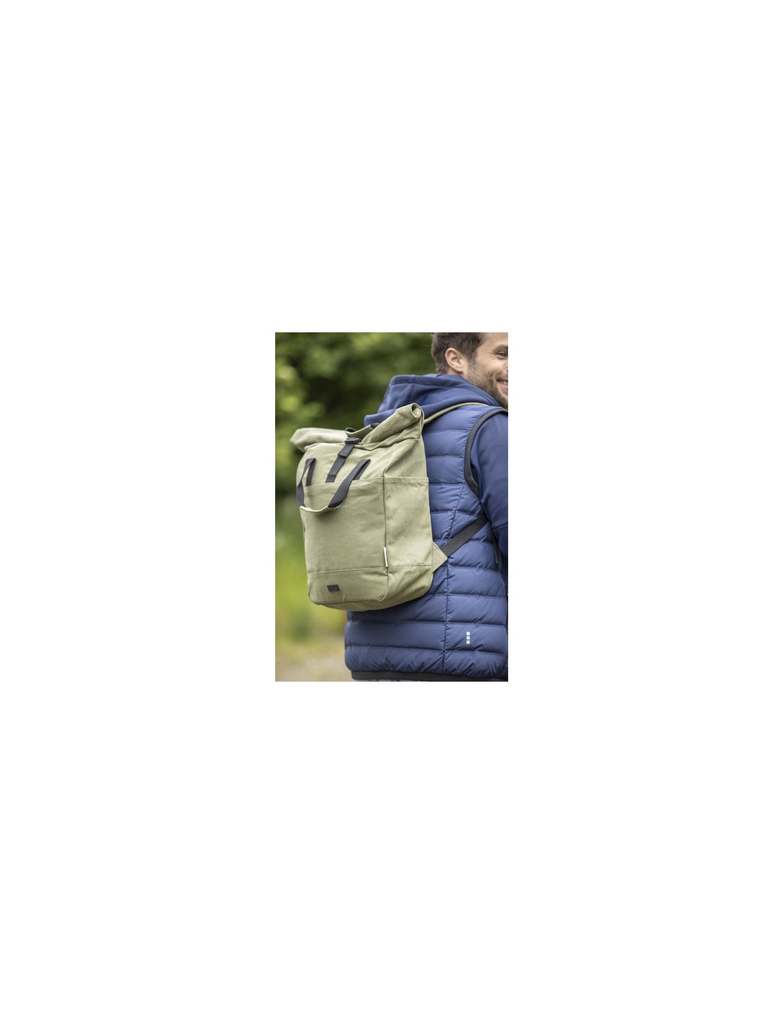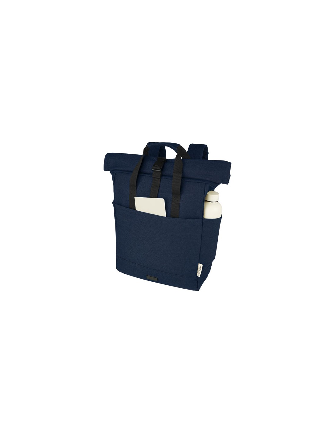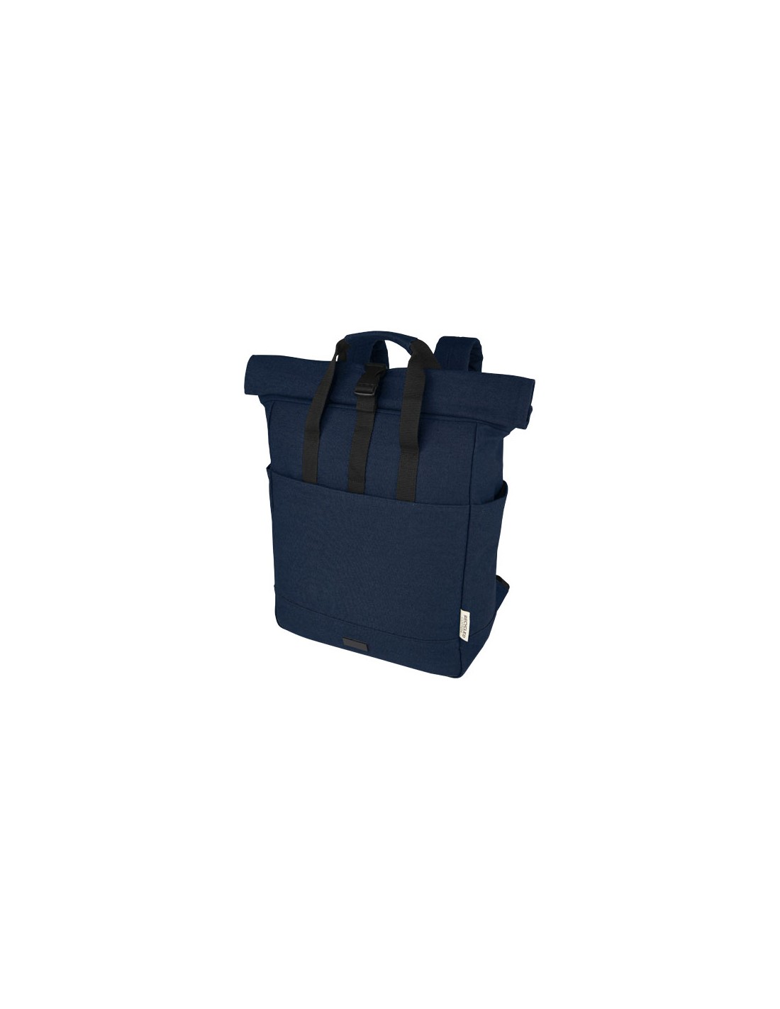 Realizzato in canvas riciclato GRS e fodera in RPET, lo zaino rolltop Joey ispirato a prodotti retail è dotato di una custodia per tablet dedicata e di uno scomparto imbottito per portatile da 15". Lo zaino presenta anche 2 tasche laterali per l'acqua e un'ampia tasca frontale con zip, nonché di un'apertura con zip sulla chiusura rolltop per offrire ancora maggior capacità contenitiva ed elevata sicurezza. Grazie ai 2 manici in tessuto rinforzato, è semplice e comodo da trasportare come una borsa da ufficio. La placca decorativa in metallo può far risaltare il tuo logo alla sottile finitura opaca.