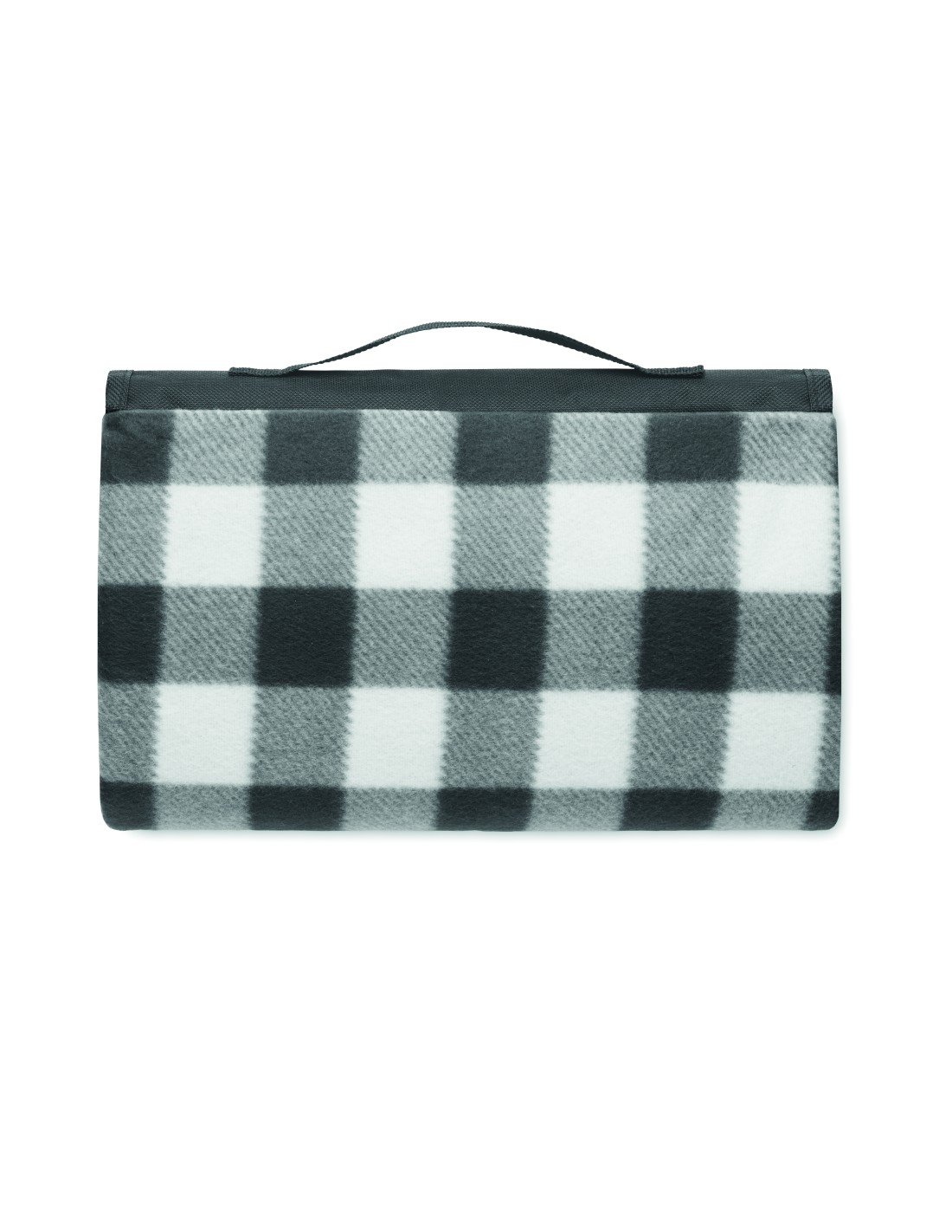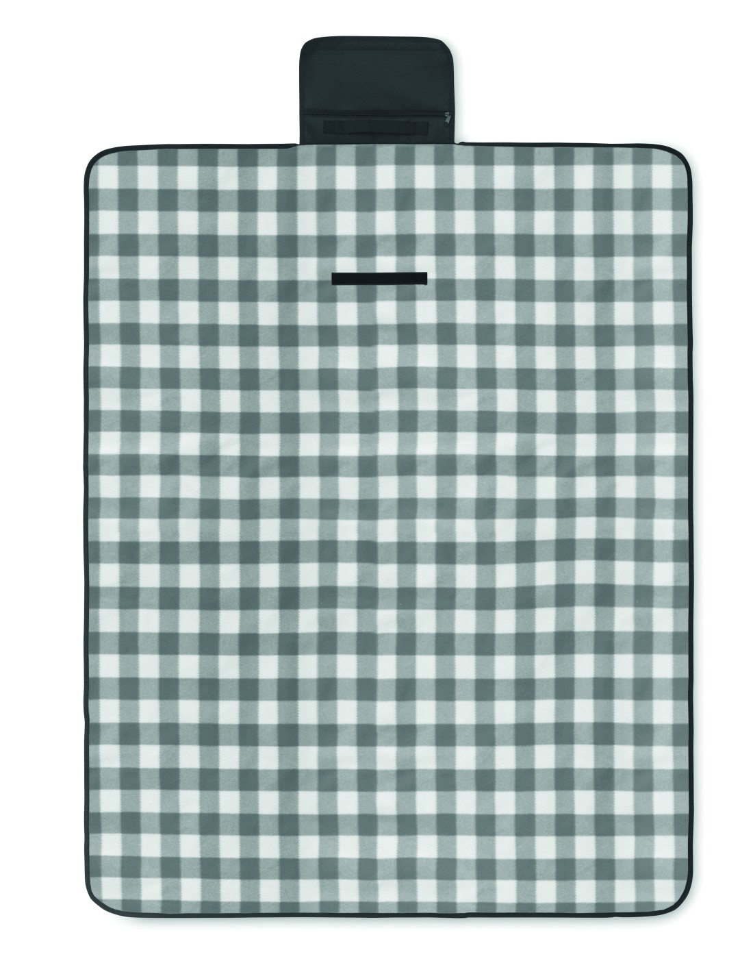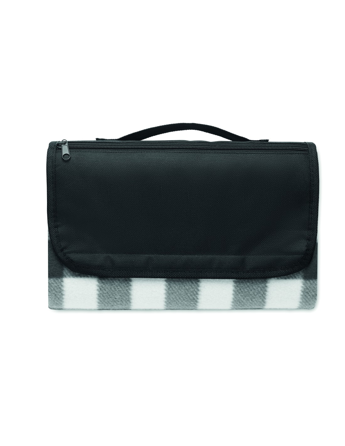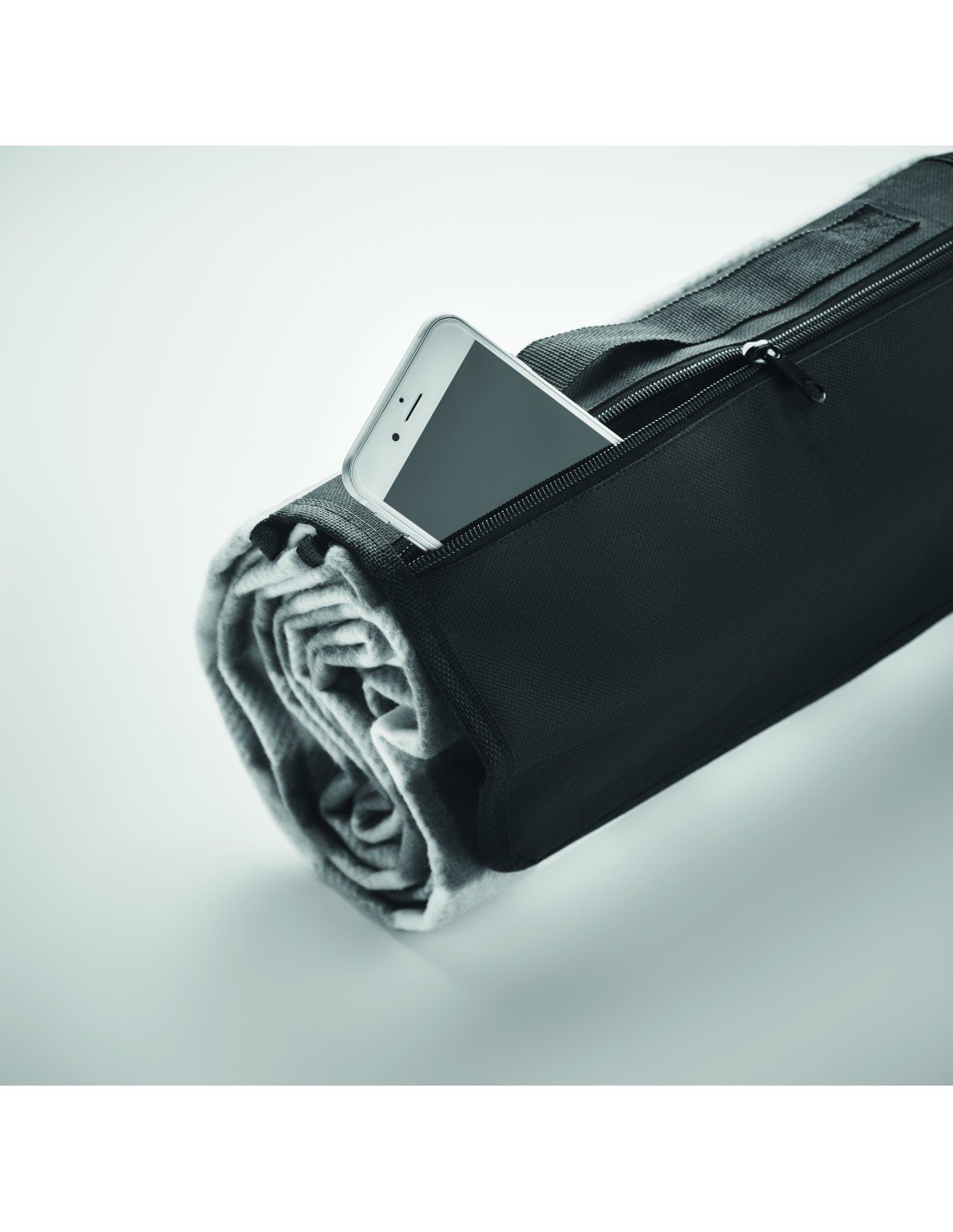 Coperta da picnic pieghevole in pile polare RPET 150 gr/m² con retro in PEVA rivestito resistente all'acqua. Include una tasca anteriore con cerniera e una cinghia di trasporto corta.