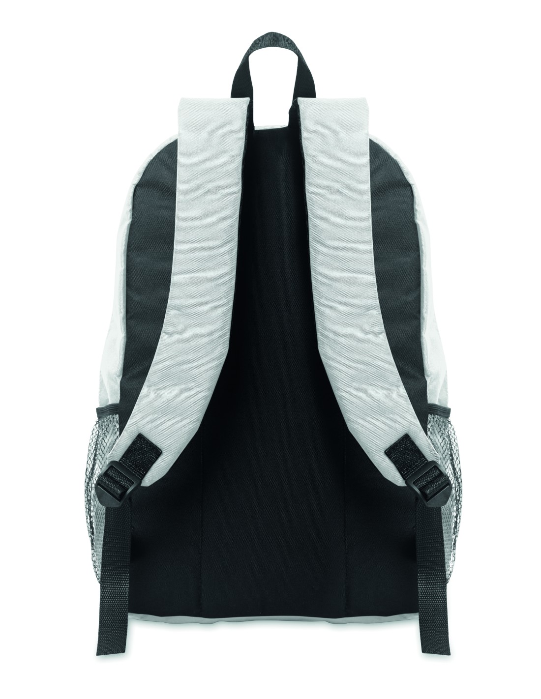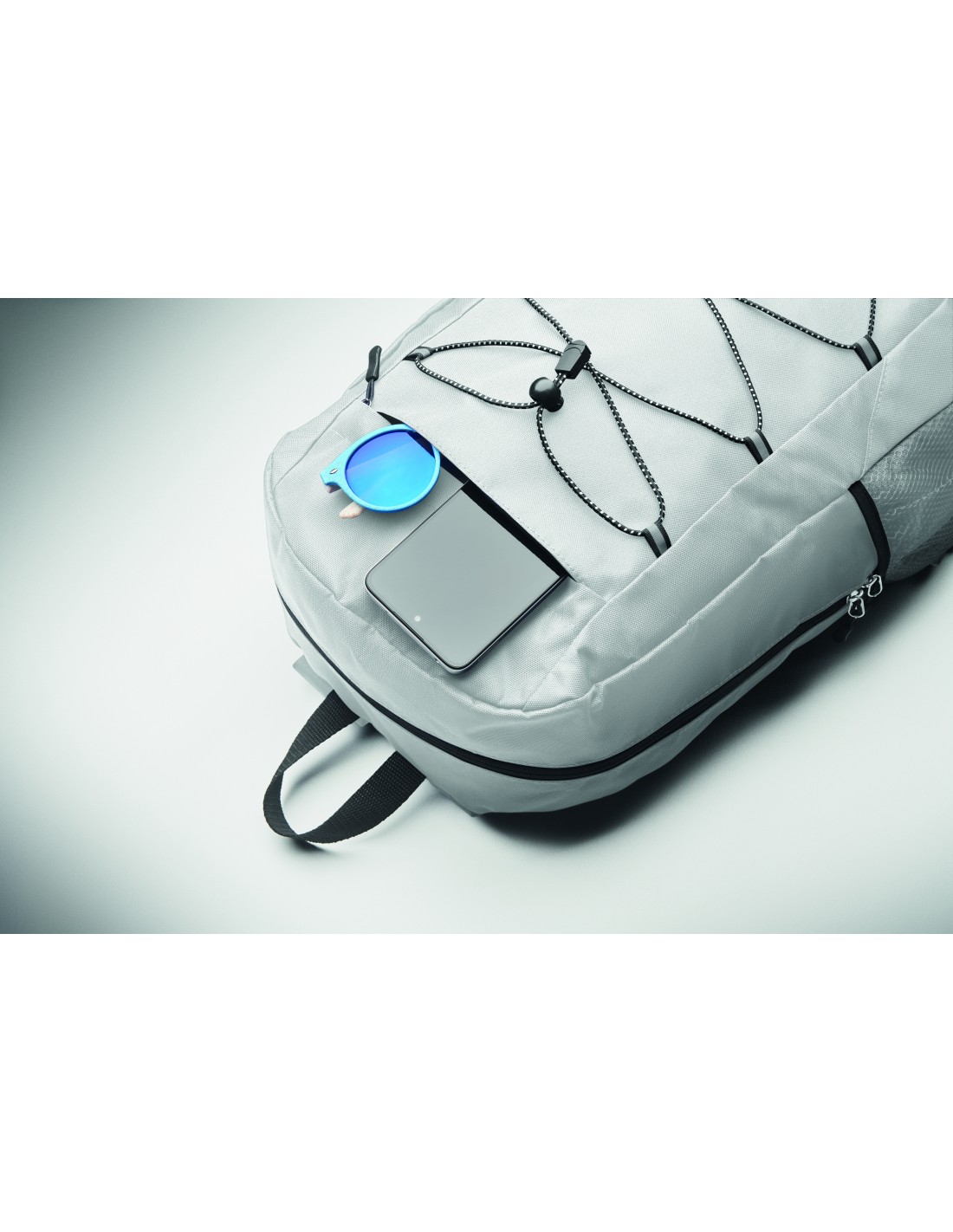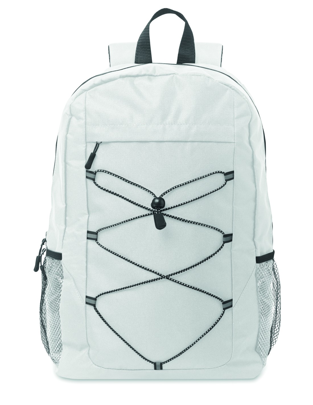 Zaino in poliestere 600D RPET con cordino decorativo e pannello frontale con cerniera. Tasche in rete su entrambi i lati.