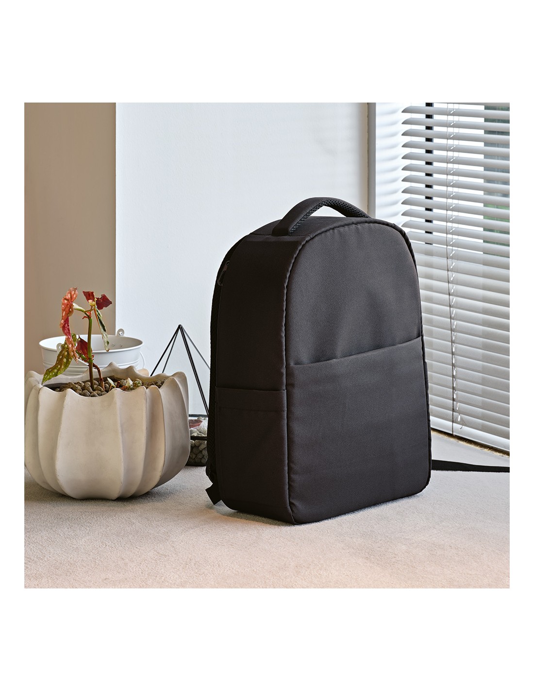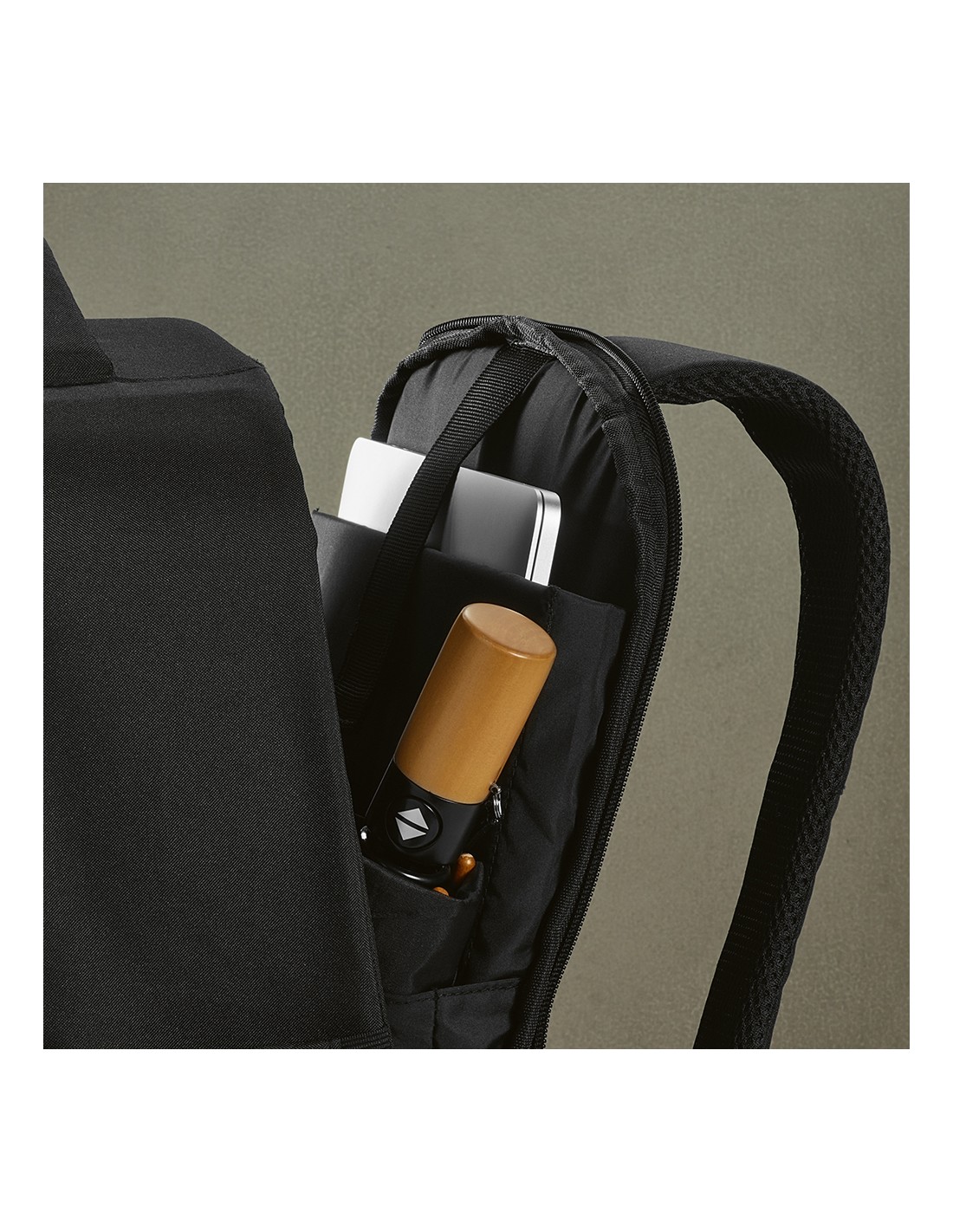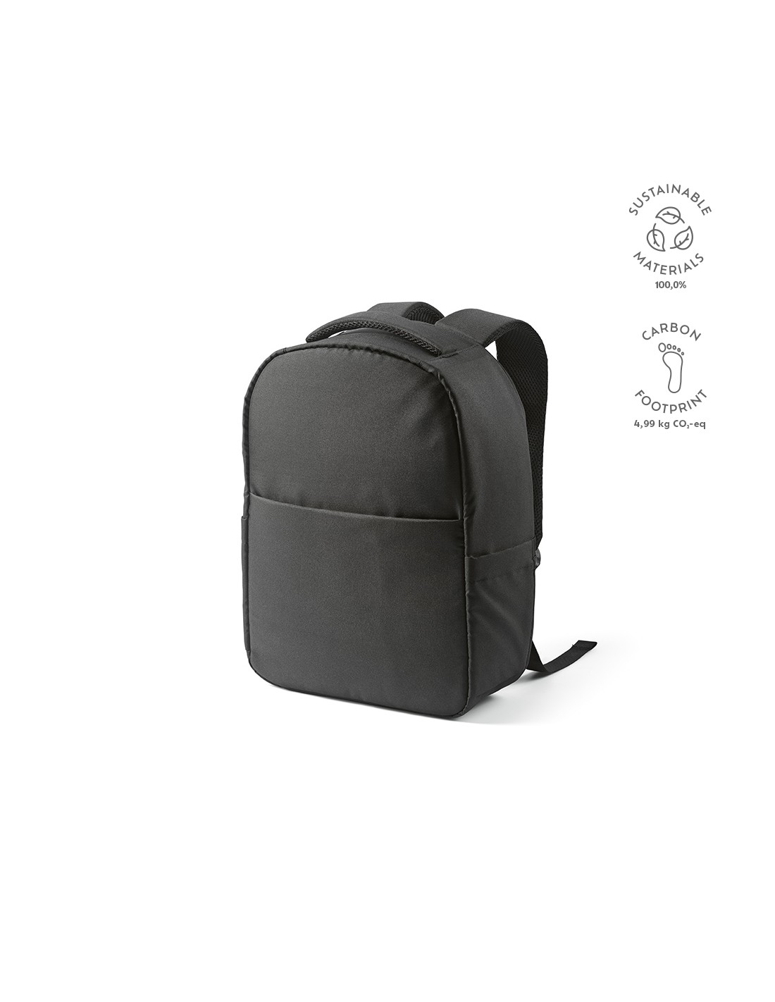 Zaino Budapest in rPET. Uno zaino da 16L con una tasca frontale nascosta, imbottitura sulla schiena, fascia per trolley, manico rinforzato e spallacci. Scomparto interno imbottito per laptop da 17"" e tasche laterali discrete per contenere una bottiglia d'acqua. Presentato in una sacca singola in cotone riciclato.