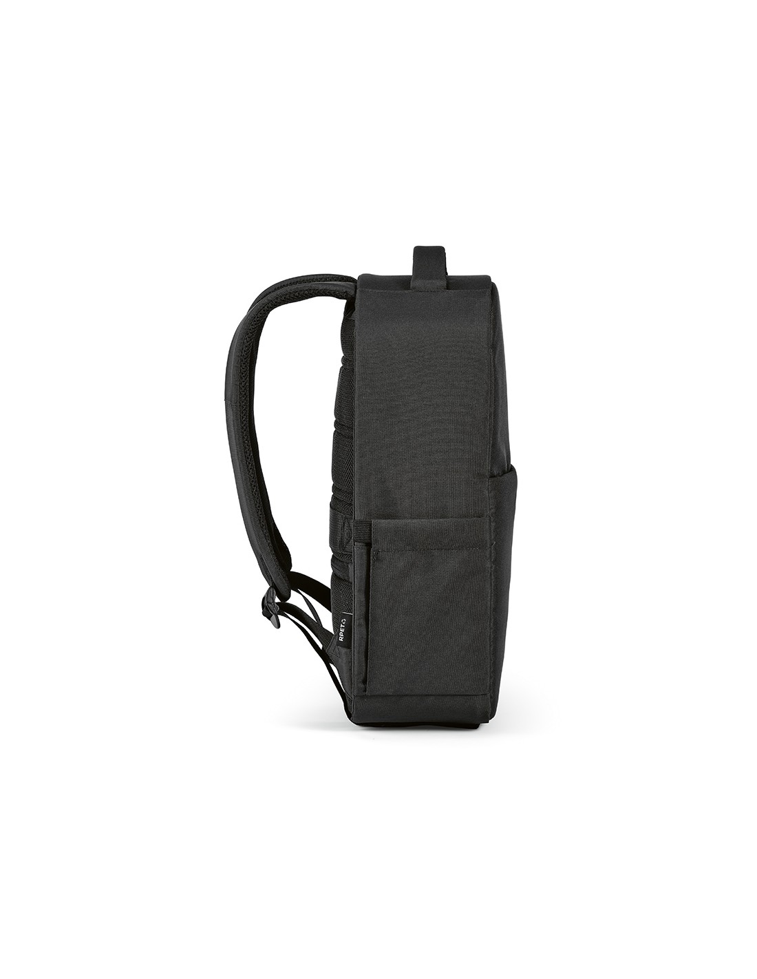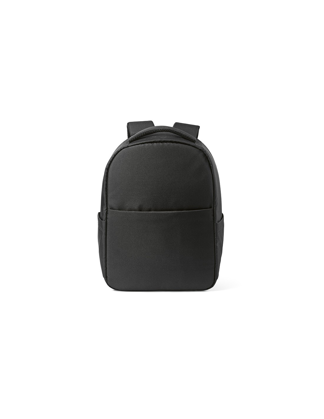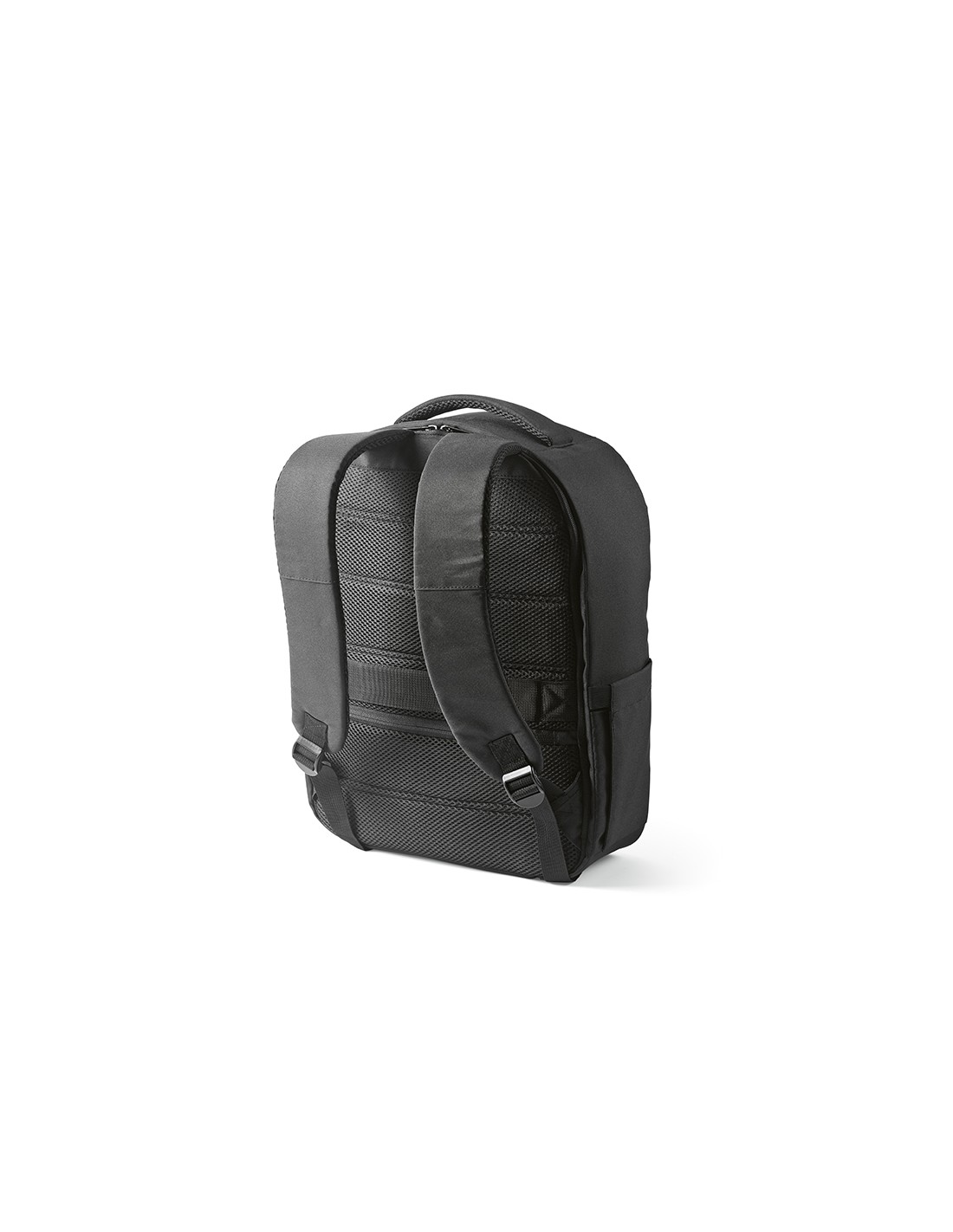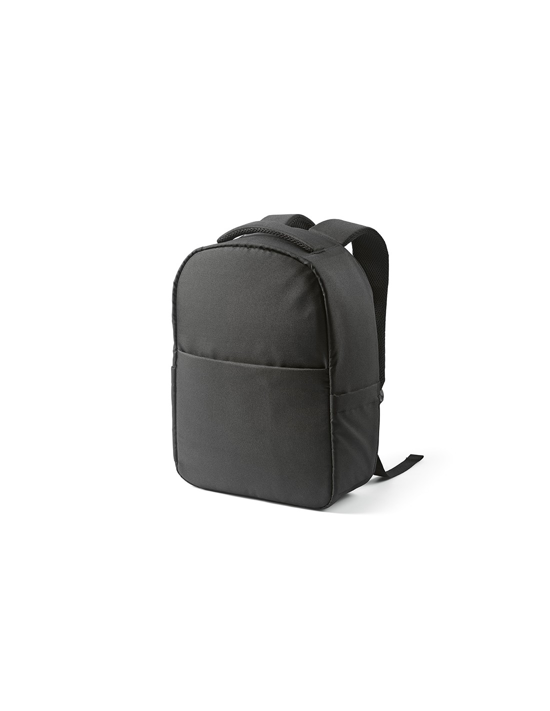 Zaino Budapest in rPET. Uno zaino da 16L con una tasca frontale nascosta, imbottitura sulla schiena, fascia per trolley, manico rinforzato e spallacci. Scomparto interno imbottito per laptop da 17"" e tasche laterali discrete per contenere una bottiglia d'acqua. Presentato in una sacca singola in cotone riciclato.